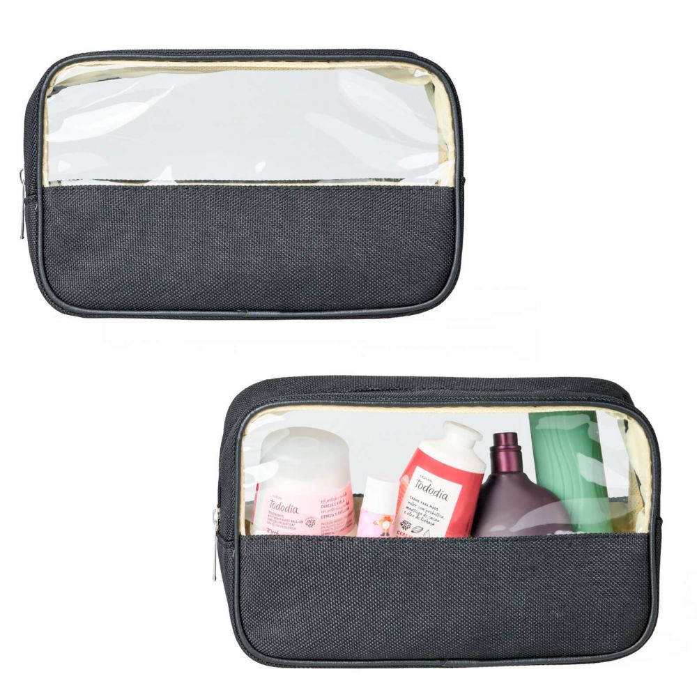 Neceser de plástico con parte superior transparente, interior forrado y cierre.