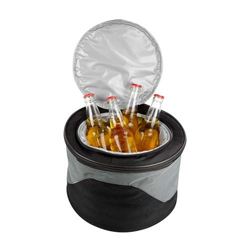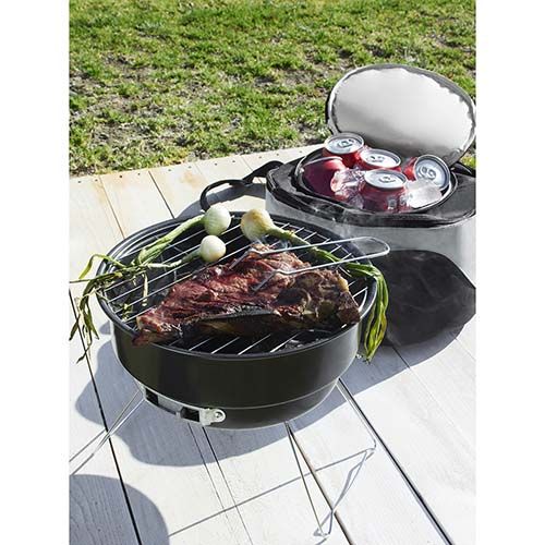 Asador portátil de carbón con hielera. Incluye parrilla con sujetador. Hielera sólo en la parte superior. Capacidad para 6 latas. Incluye asa y correa ajustable desprendible.
