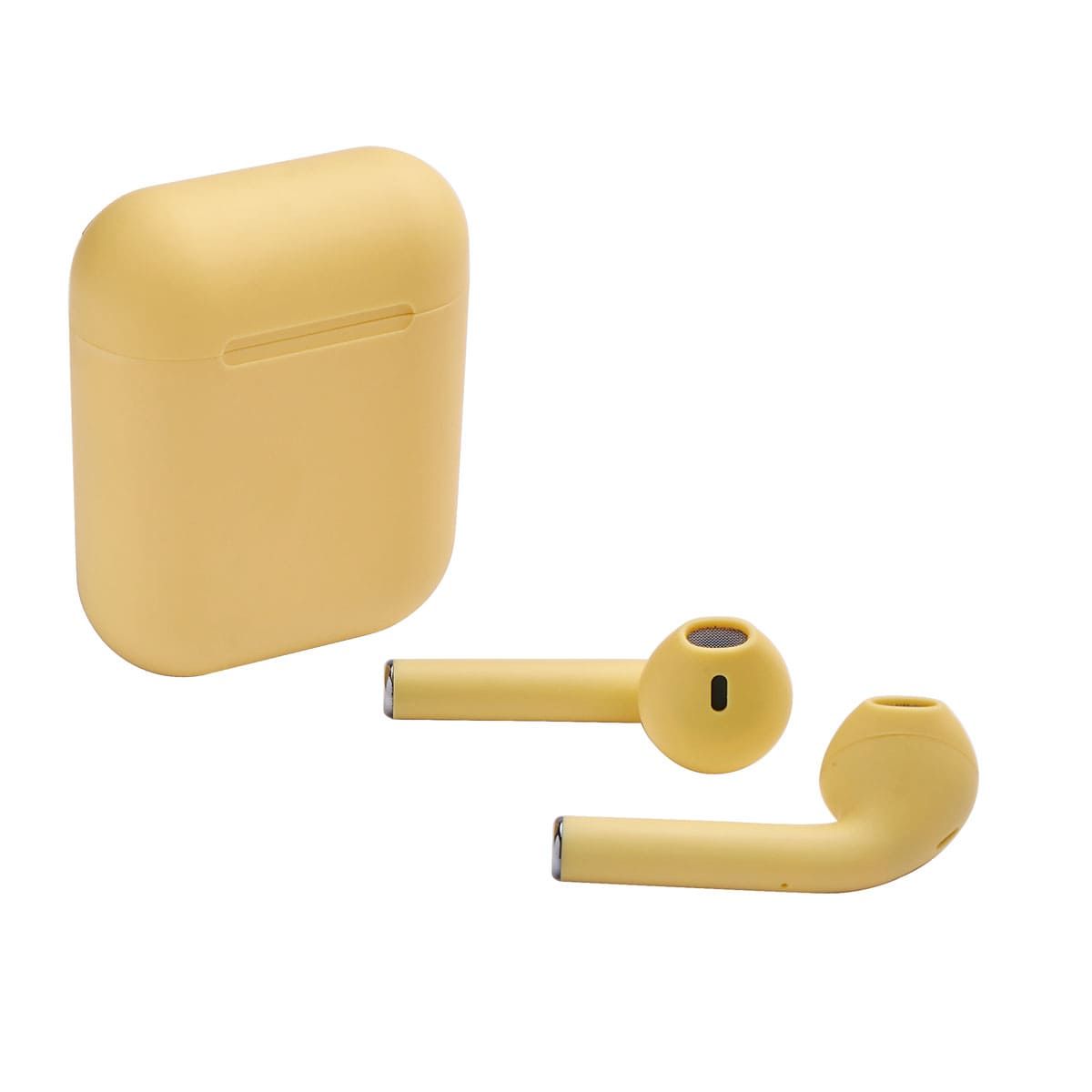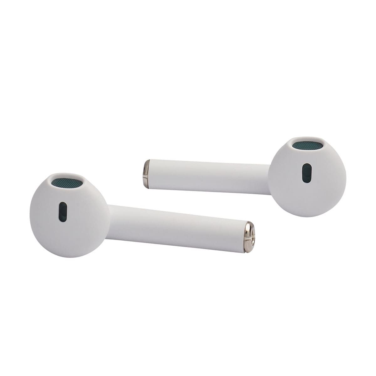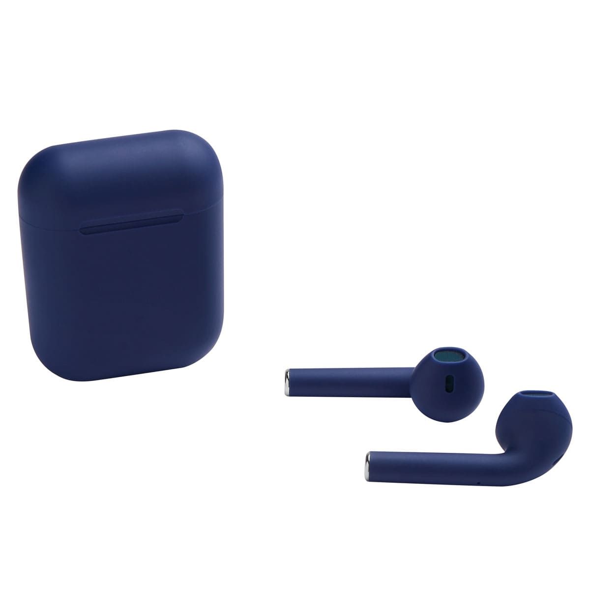 Audífonos bluetooth con terminado rubber y estuche recargable. Control touch para reproducción de música y función de llamada. Reproducción de música de 2 a 3 horas aproximadamente. Rango de conexión de 10 metros. Batería de 30 mAh (audífonos) y 200 mAh (estuche). Incluye estuche con puerto lightning y cable auxiliar.