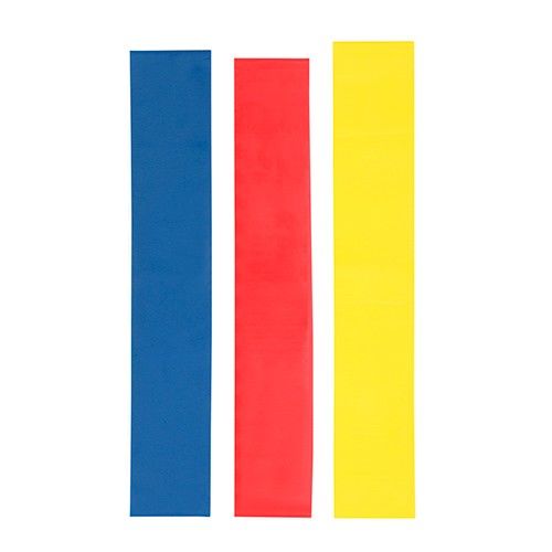 Set de 3 bandas elásticas con diferentes resistencias. Banda roja con resistencia alta, banda amarilla con resistencia media y banda azul con resistencia baja. Incluye bolsa con jareta.