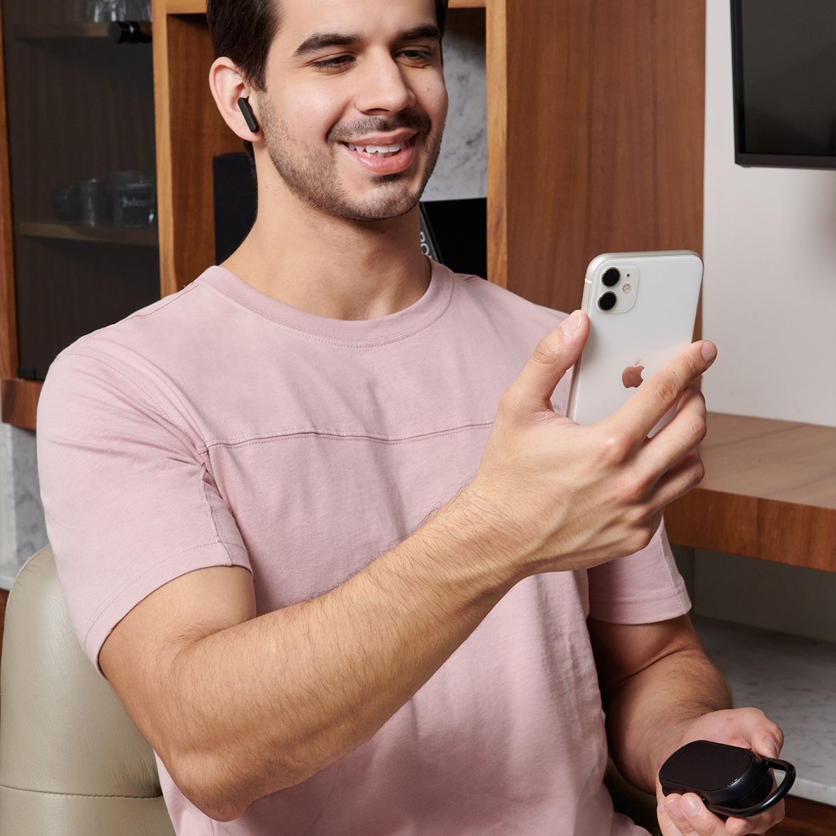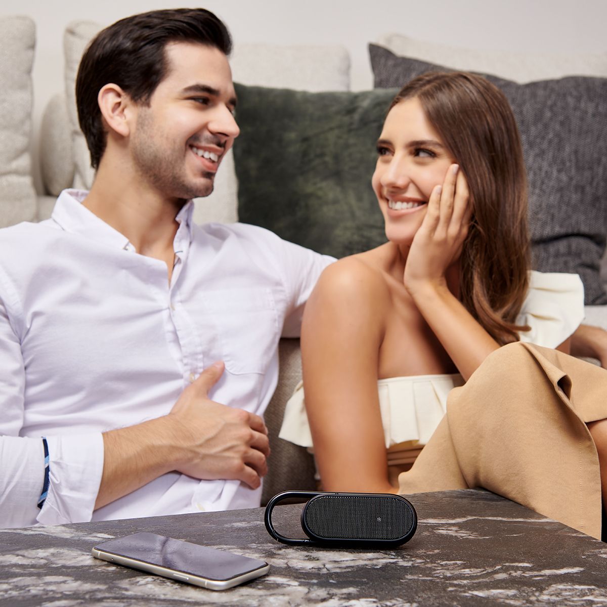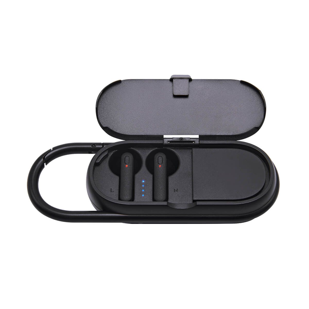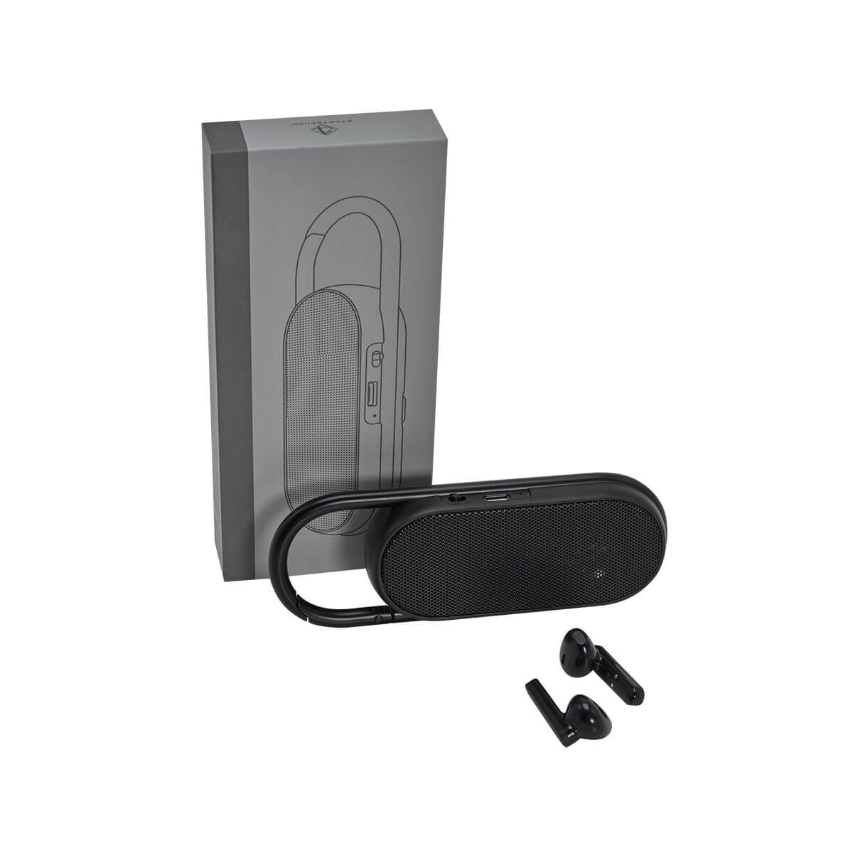 Bocina con audífonos bluetooth integrados. Pueden utilizarse ambas funciones al mismo tiempo. Controles integrados touch para volumen y reproducción de audio. Rango de conexión 10 metros. Asa integrada tipo gancho para transportarla fácilmente. Incluye cable cargador USB.