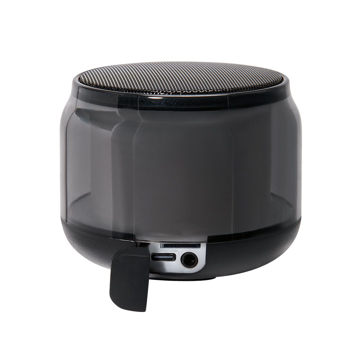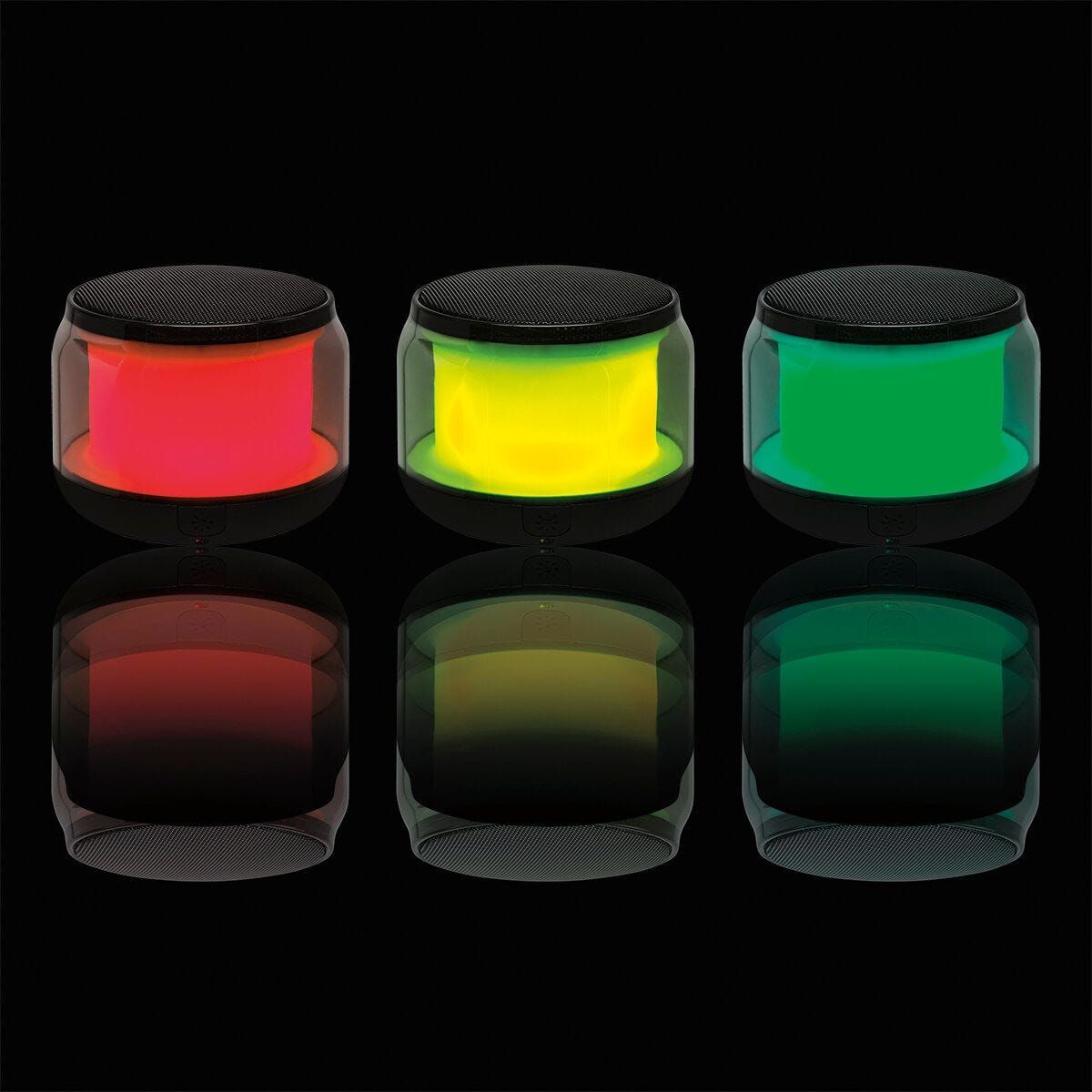 Bocina bluetooth recargable con luz RGB ajustable a 3 efectos diferentes. Reproducción de música 3 hrs aproximadamente. Controles integrados para llamadas, volumen y reproducción de audio. Rango de conexión 10 metros. Cuenta con puerto Tipo C, TF y entrada auxiliar de 3.5 mm. Incluye cable cargador USB.