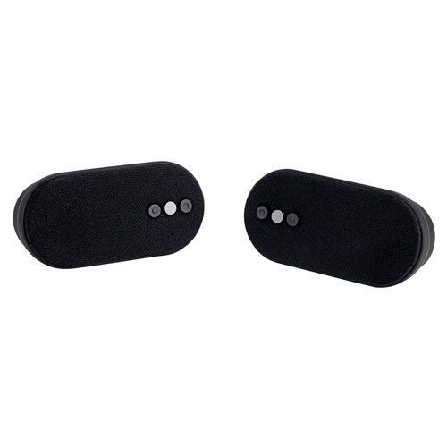 Bocinas bluetooth portátiles TWS con batería recargable. Reproducción de música 5 hrs aproximadamente. Función manos libres. Controles integrados de llamada, volumen y reproducción de audio. A prueba de salpicaduras. Bocinas desmontables para uso en espacios pequeños. Incluye collar y cable cargador USB.