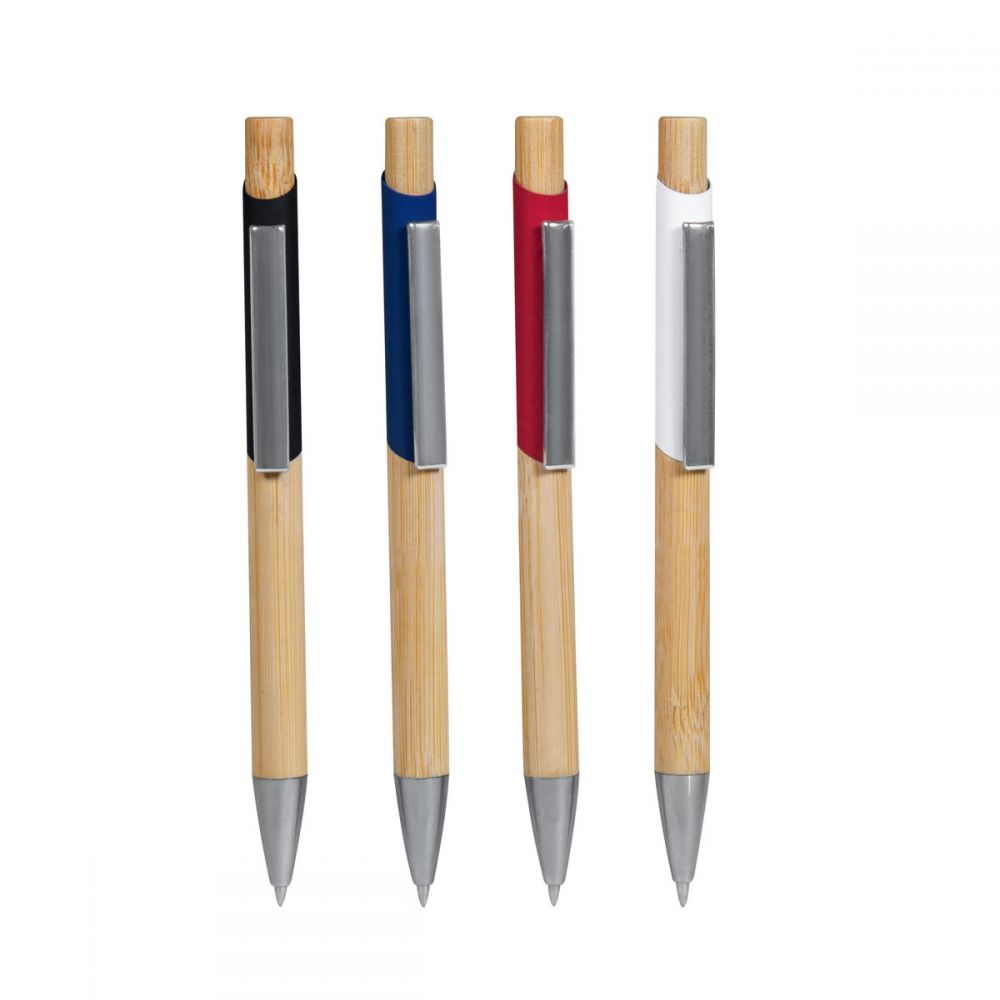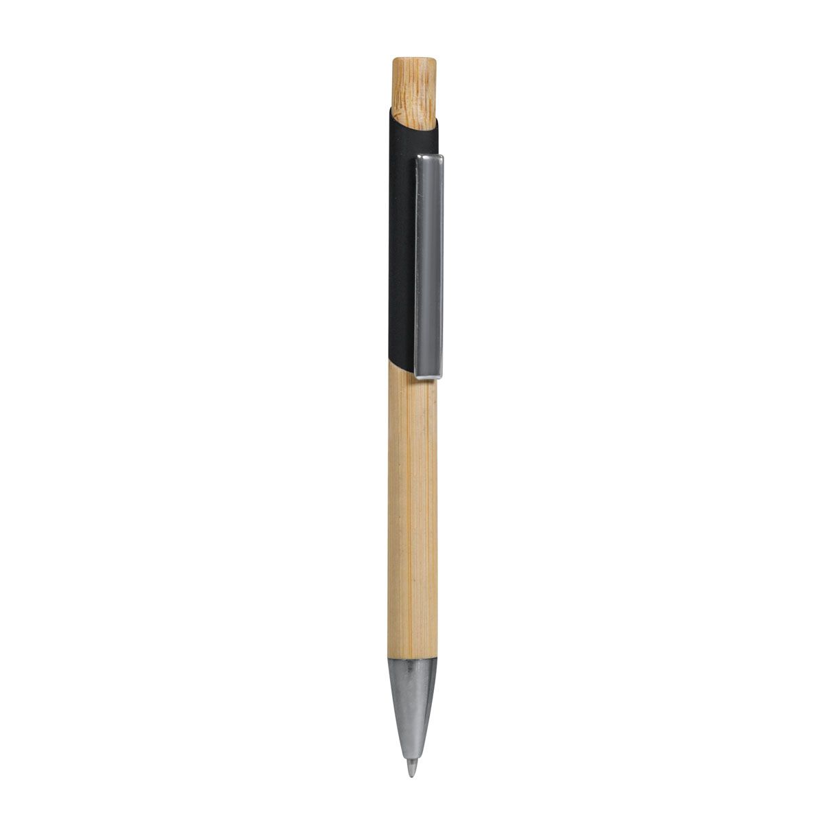 Bolígrafo con terminado tipo rubber y grip de bambú. Acabados metálicos en clip y punta. Mecanismo pulsador.