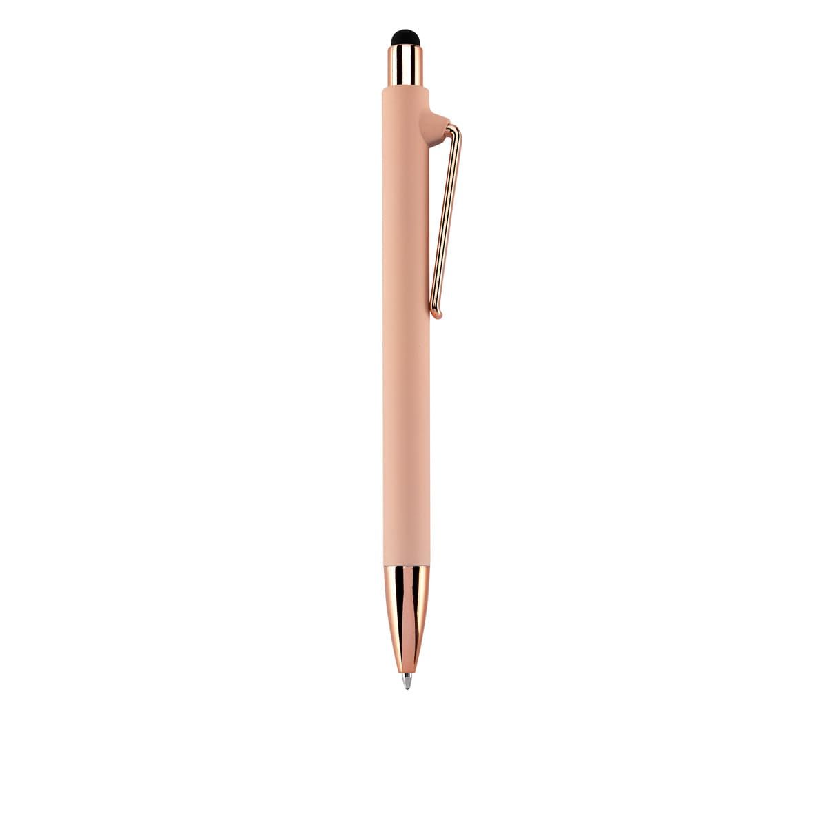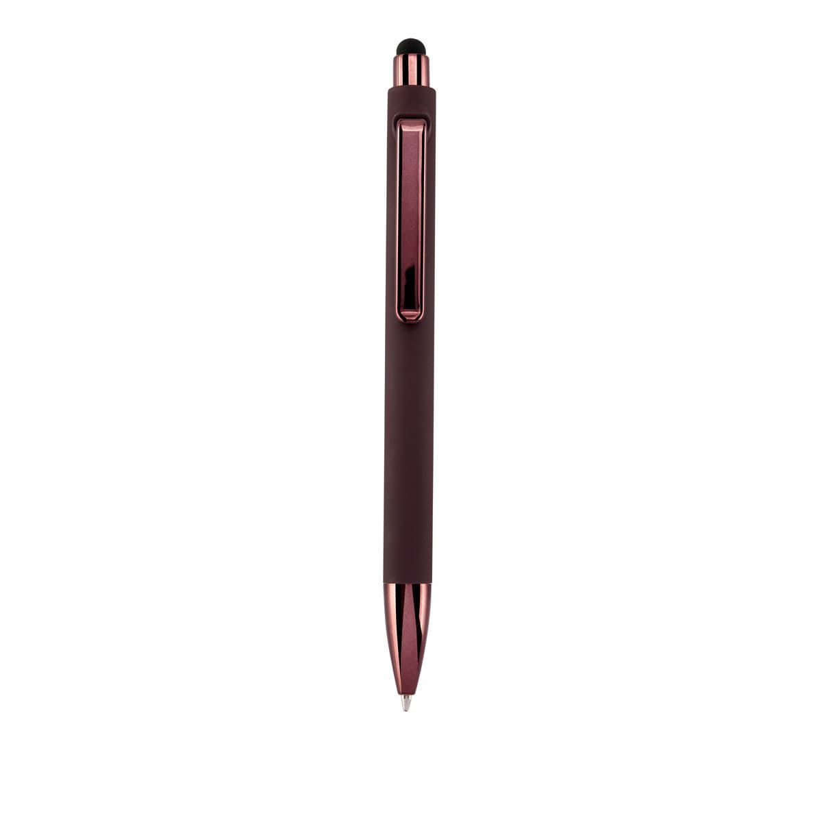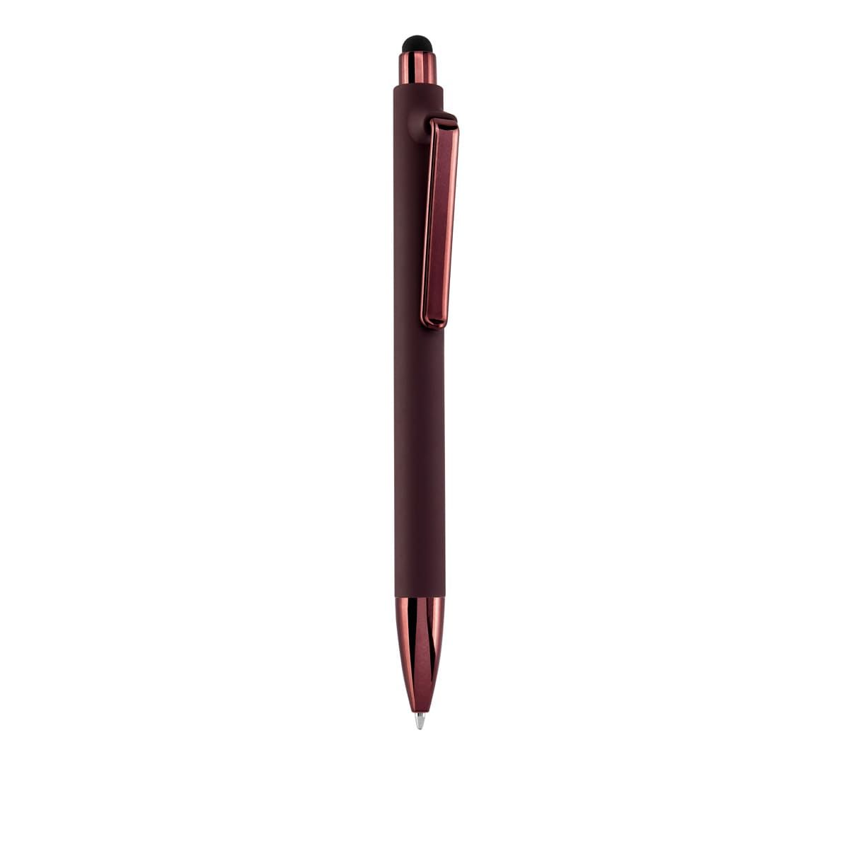 Bolígrafo con terminado tipo rubber y touch screen. Mecanismo pulsador. Botón, clip y punta en color metalizado al tono.