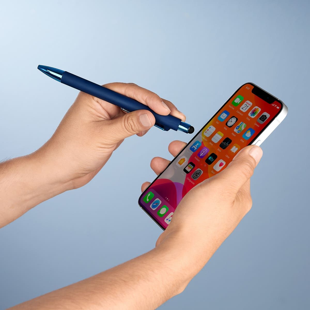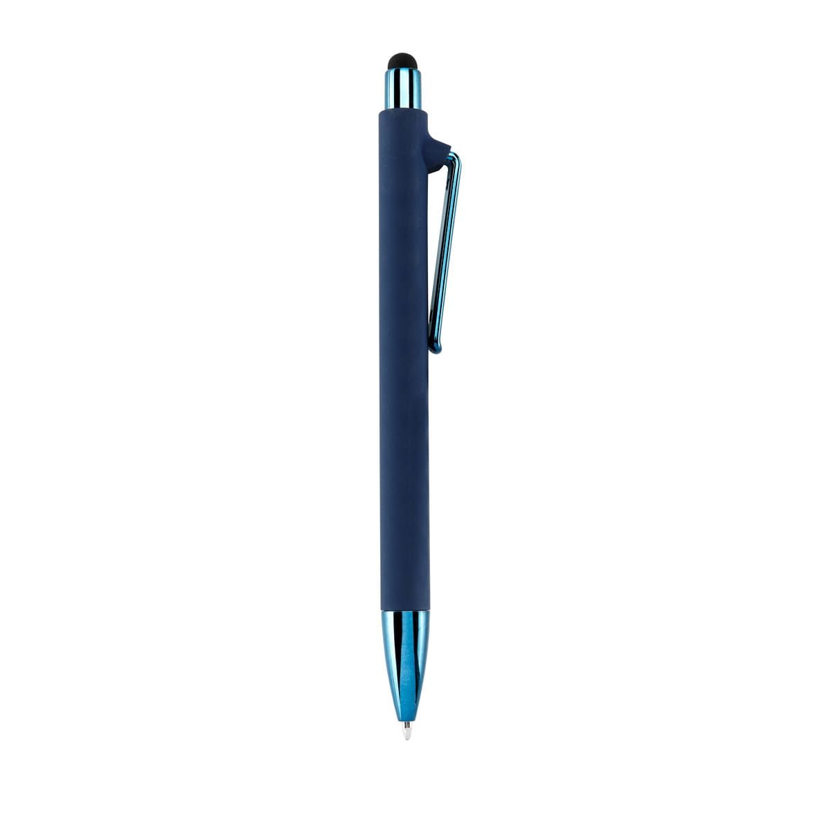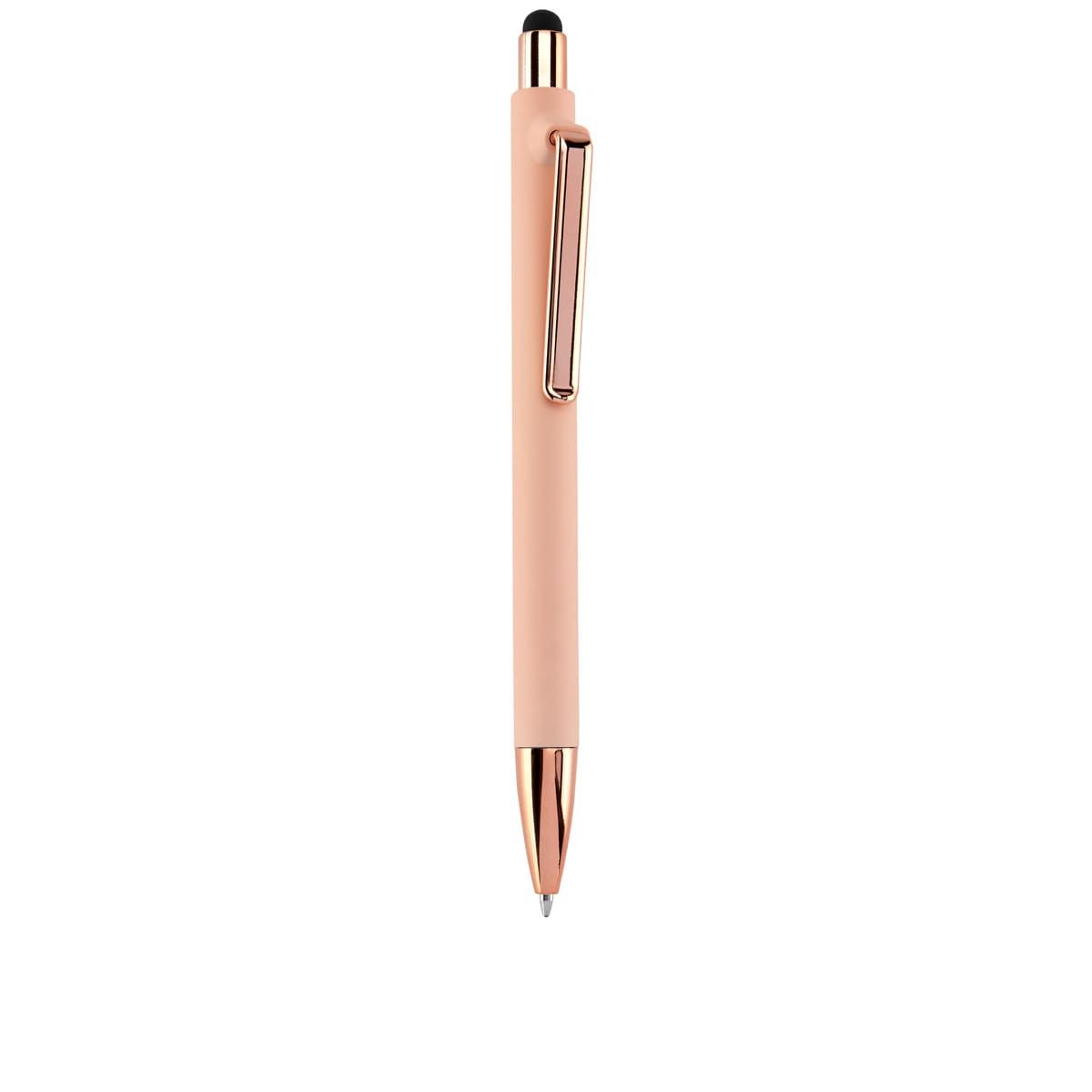 Bolígrafo con terminado tipo rubber y touch screen. Mecanismo pulsador. Botón, clip y punta en color metalizado al tono.