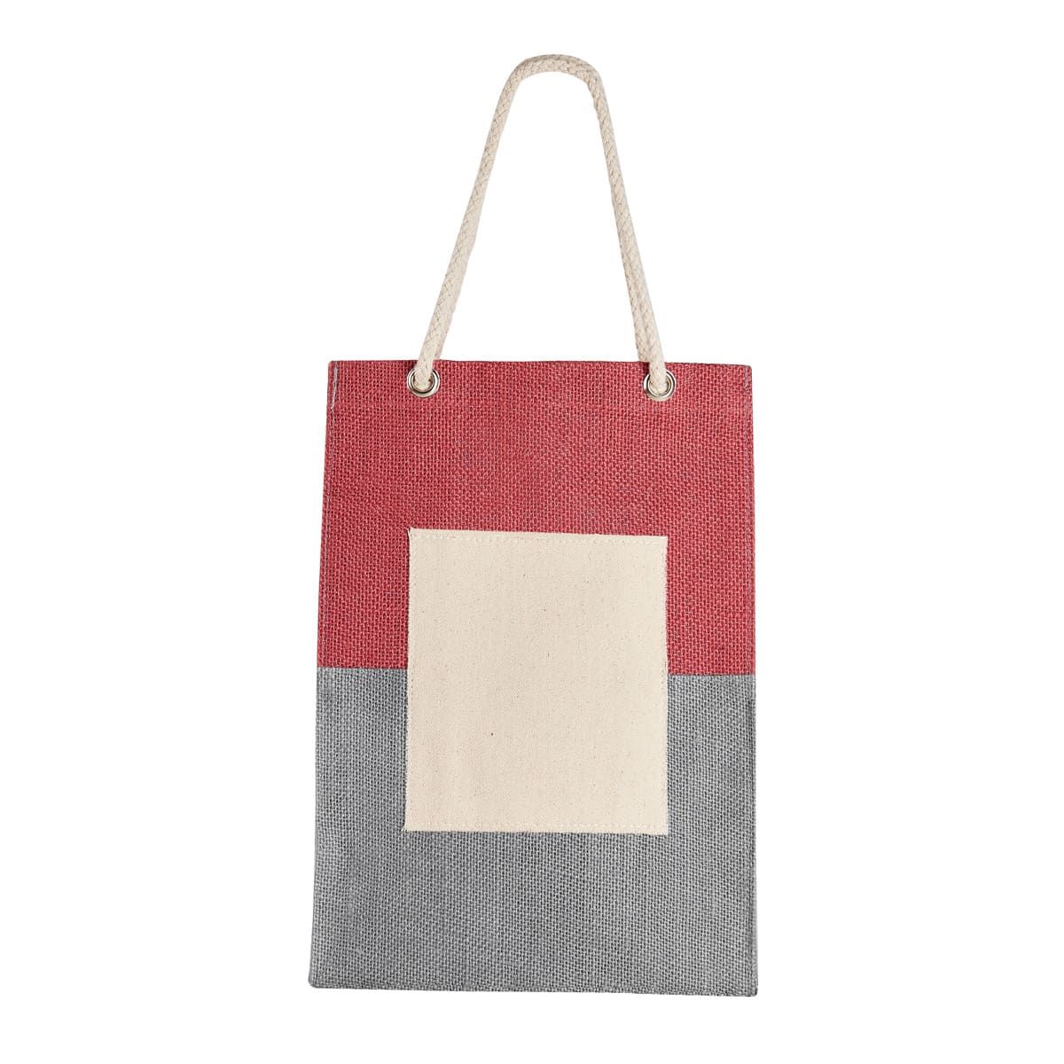 Bolsa con interior laminado y asas de cordones de algodón. Diseño en dos colores contrastantes. Parche frontal para impresión.