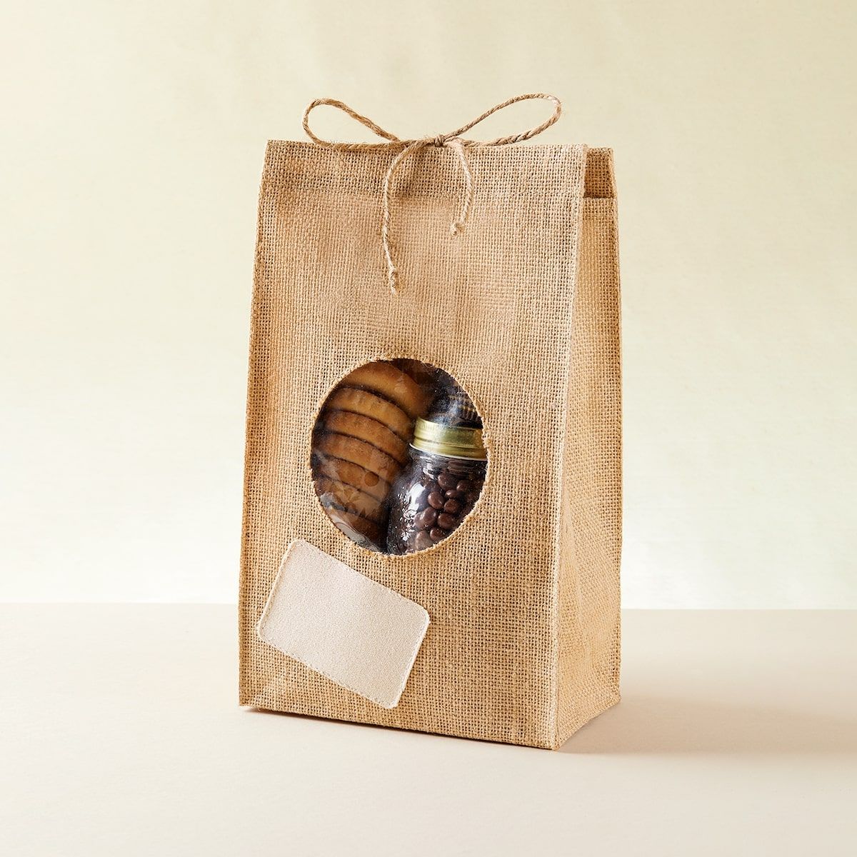 Bolsa de yute laminada. Cierre de cordón. Ventana de PCV y parche de algodón para impresión.