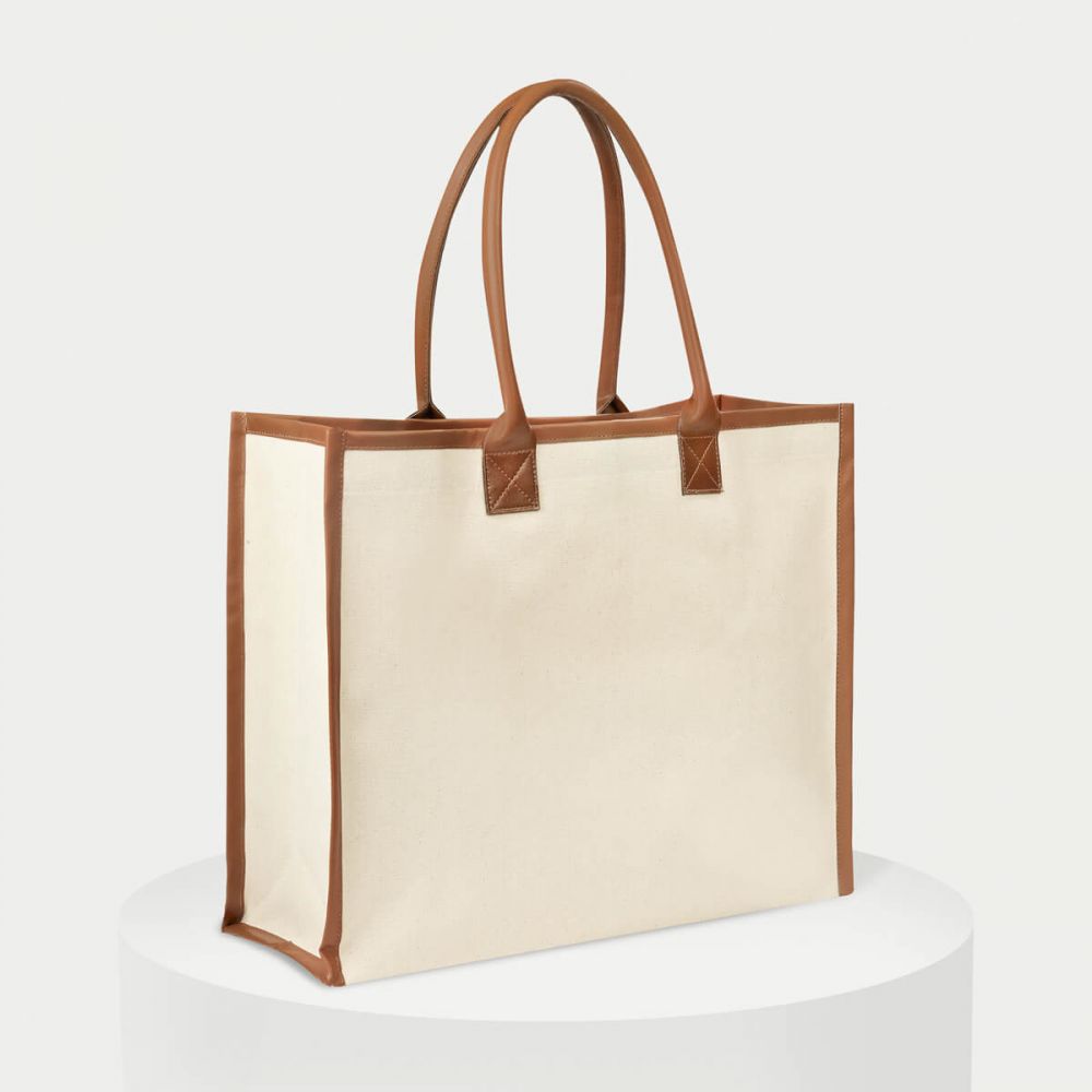 Bolsa de canvas con fuelle. El marco y las asas redondeadas de curpiel le aportan un toque sofisticado y estilizado, elevando su diseño clásico a otro nivel. Su cerrado es con broche magnético. Incluye un pequeño bolsillo al interior.