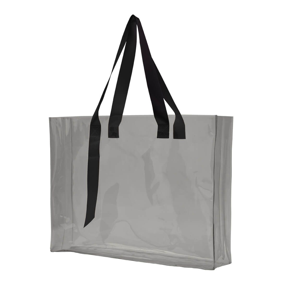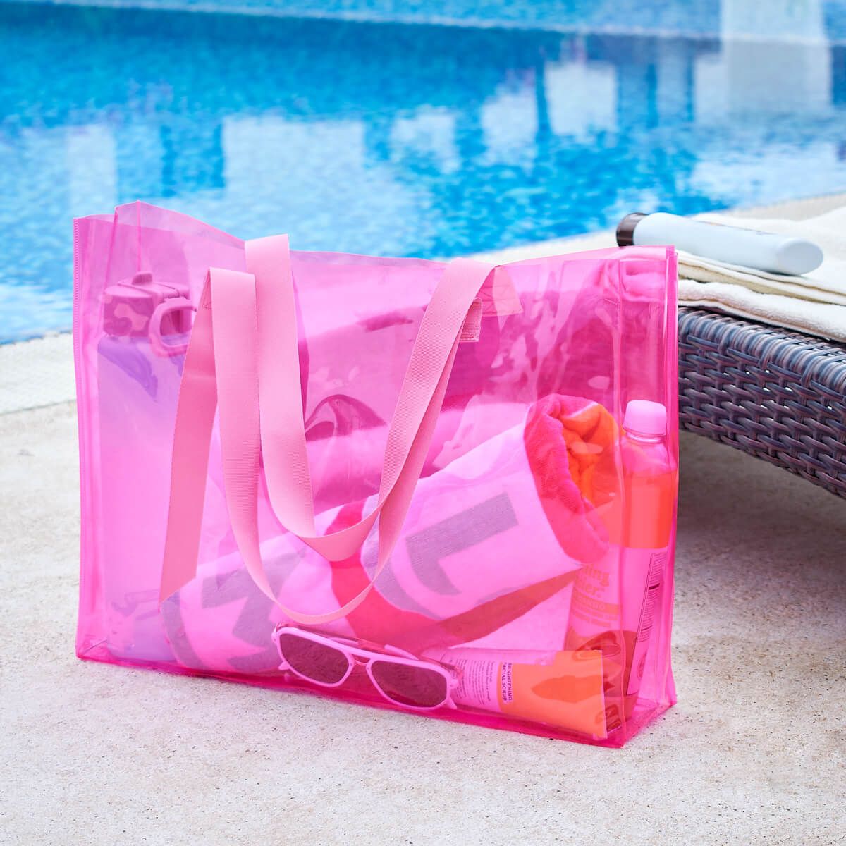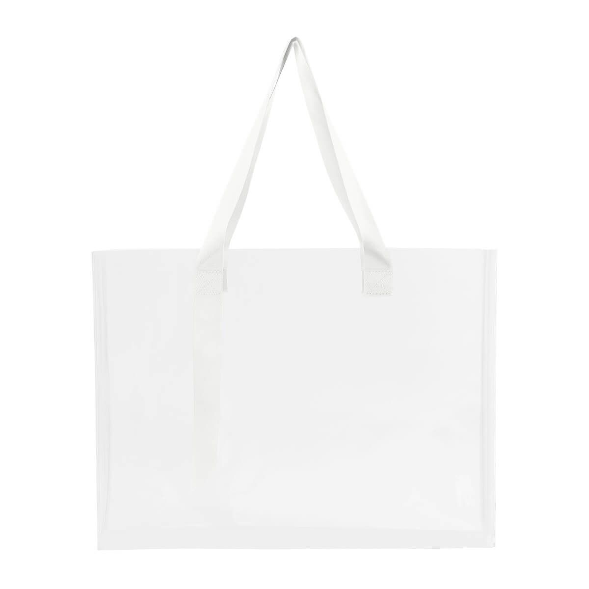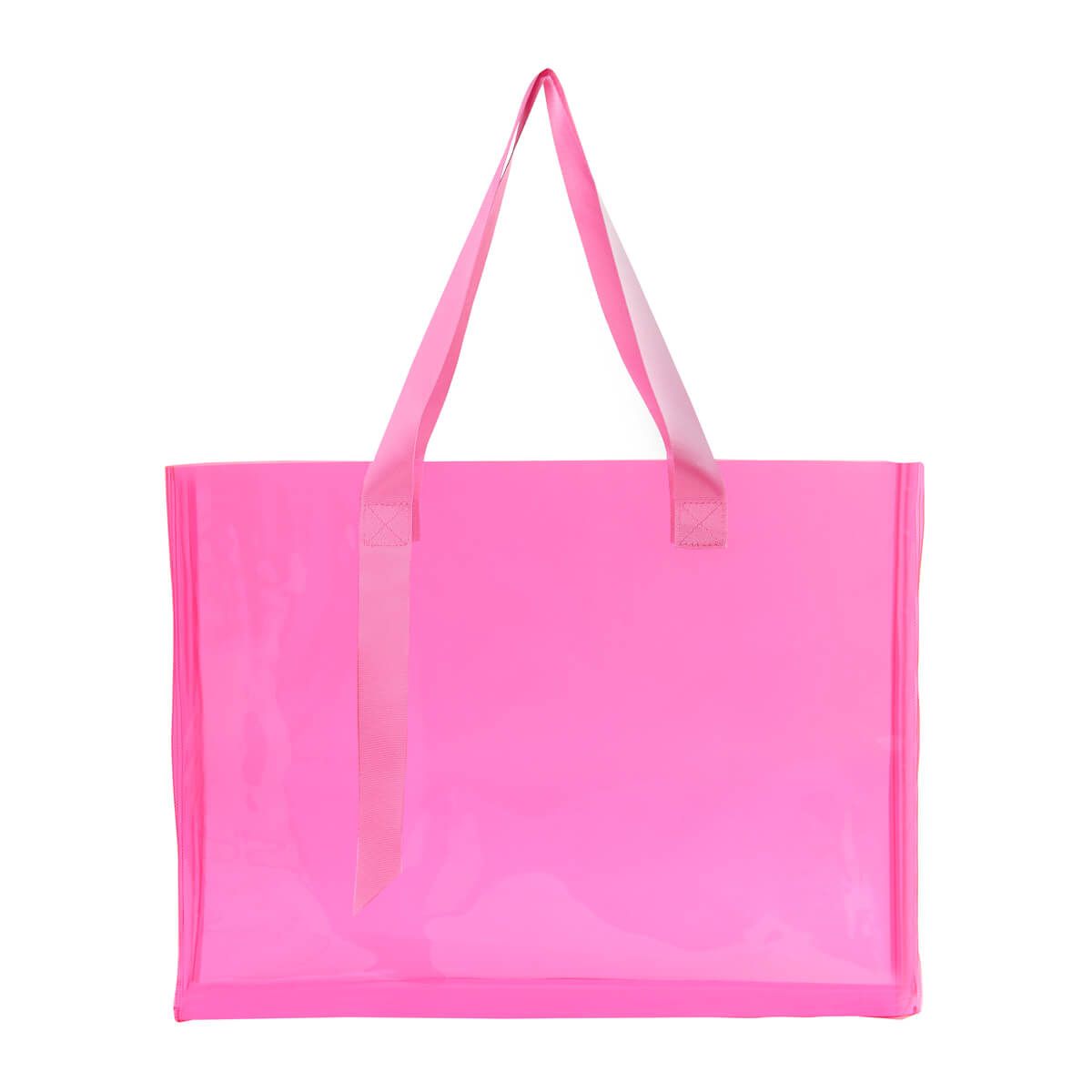 Bolsa con fuelle. Su material de plástico transparente, le da un toque justo de color y estilo. Sus asas de poliéster permite llevarla comodamente al hombro.