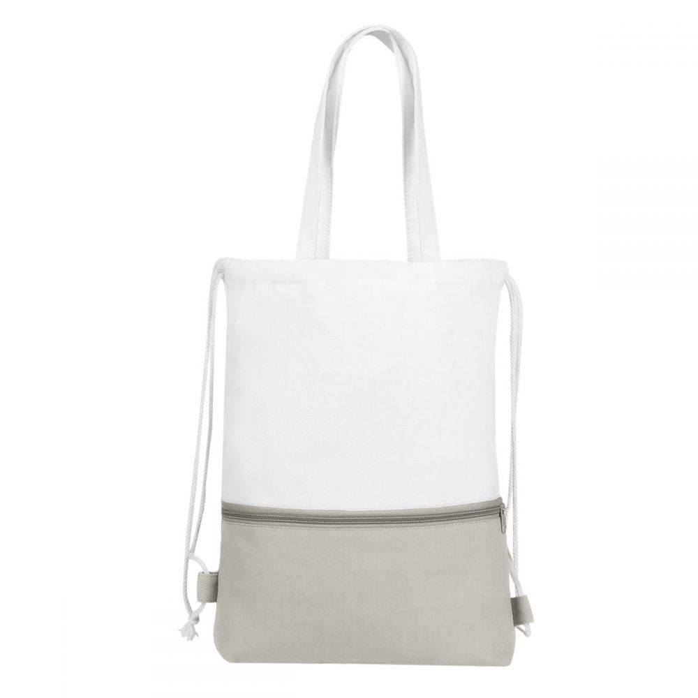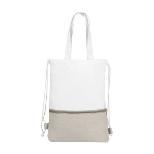Bolsa-mochila con tirantes de cordón y cerrado de jareta. Cuenta con una bolsa frontal con cierre y asas.