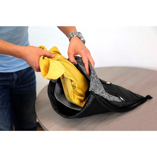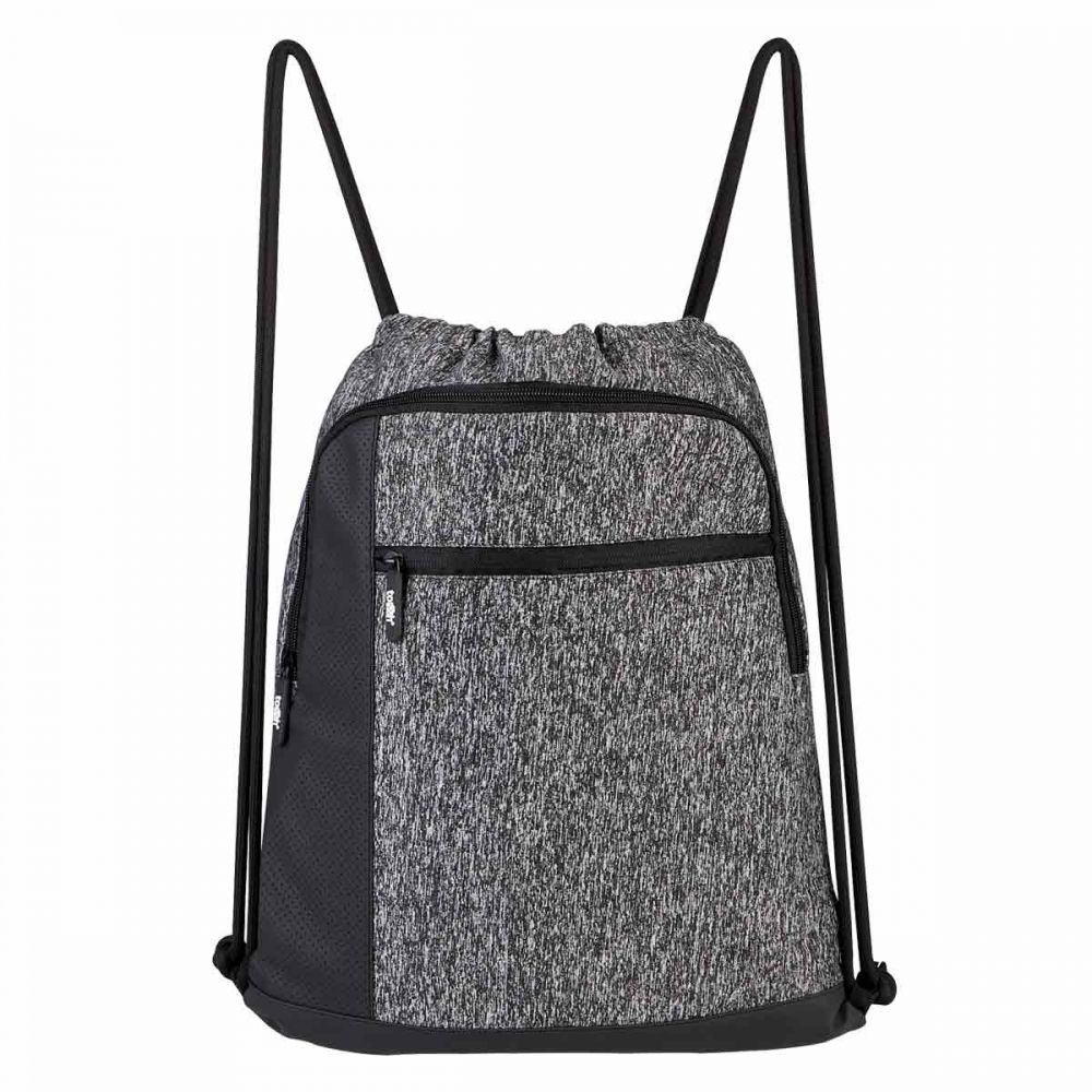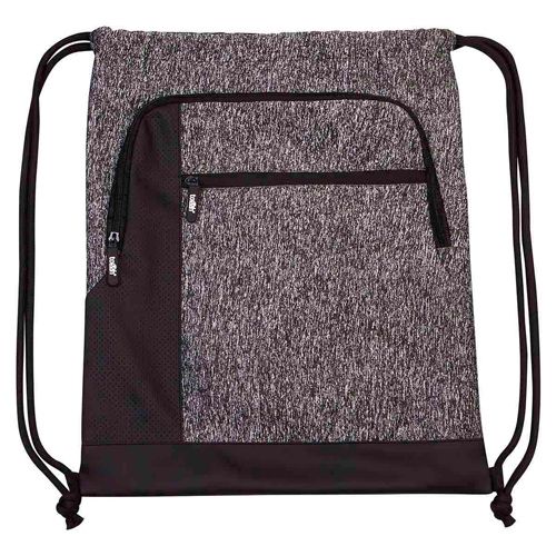 Bolsa-mochila con tirantes gruesos de cordón y cerrado de jareta. Cuenta con 2 bolsas frontales con cierre y compartimento interno plastificado impermeable.