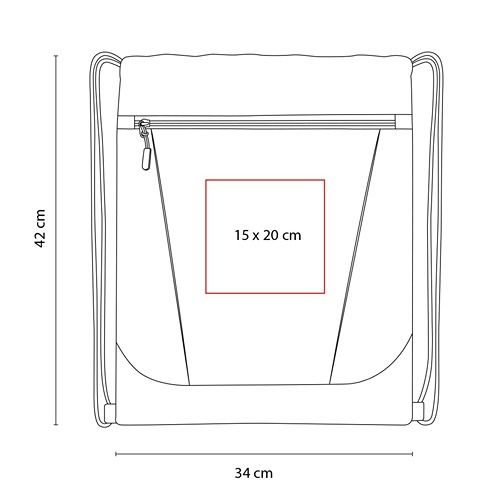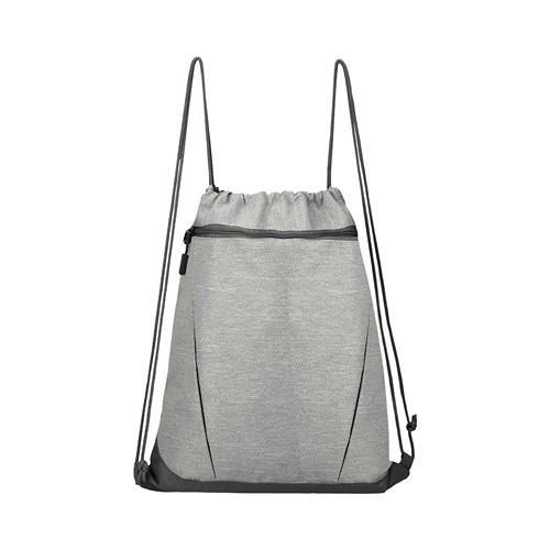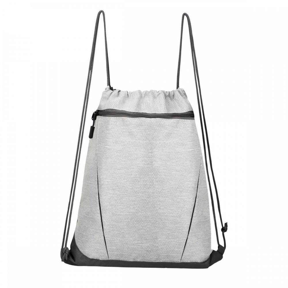 Bolsa-mochila gris, material jaspeado, bolsillo frontal con cierre, con tirantes de cordón y cerrado de jareta.