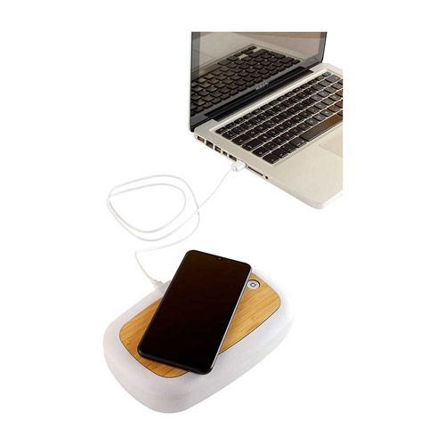 Caja con luz UV sanitizadora para celular y otros artículos. Función carga inalámbrica en cubierta. Se necesita estar conectado para la carga. Incluye cable USB para fuente alimentadora. No abrir tapa en funcionamiento para no reflejar la luz UV directo a tu cara o piel.