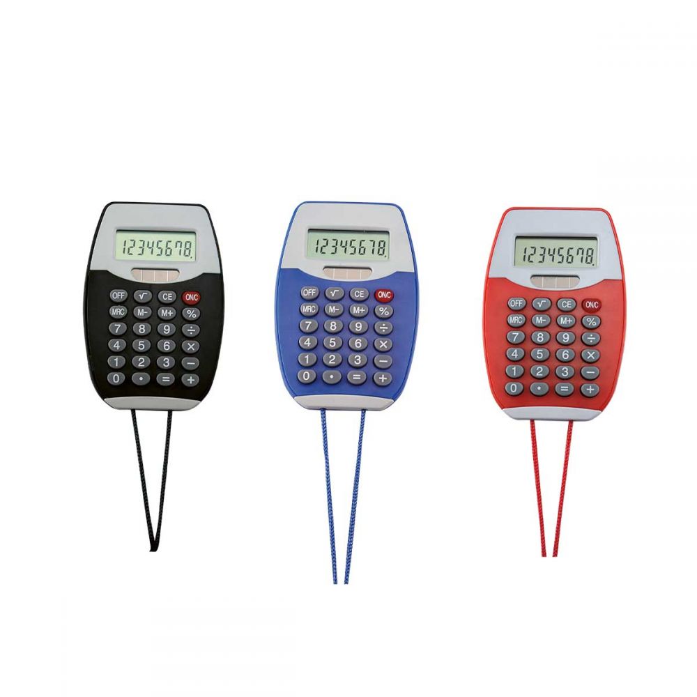 Calculadora de 8 dígitos. Incluye cordón de 48 cm. Batería solar.