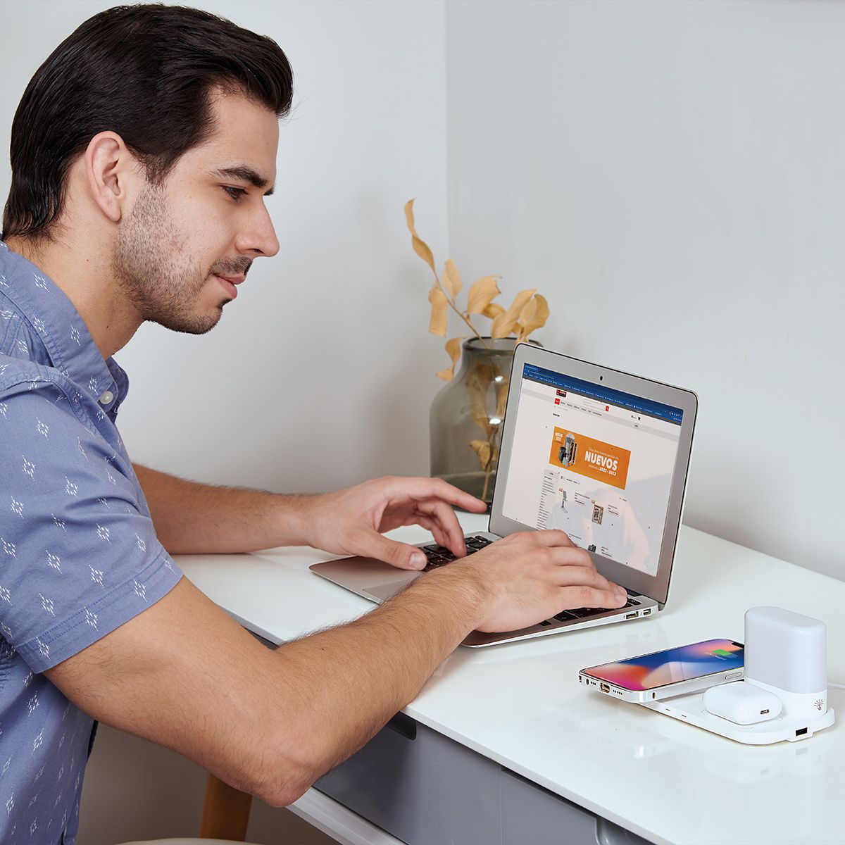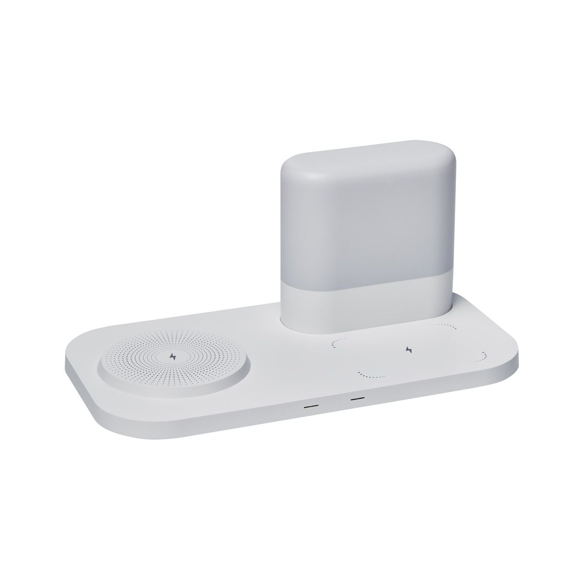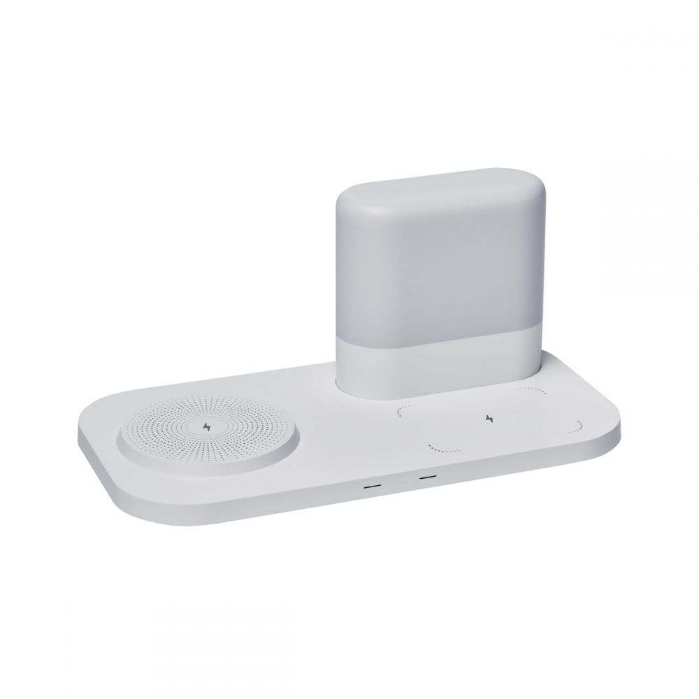 Cargador inalámbrico para smartphone y earbuds. Incluye lámpara touch con 3 diferentes intensidades. Salida USB para conectar otro dispositivo como por ejemplo un smartwatch. Incluye cable auxiliar tipo C y caja individual.