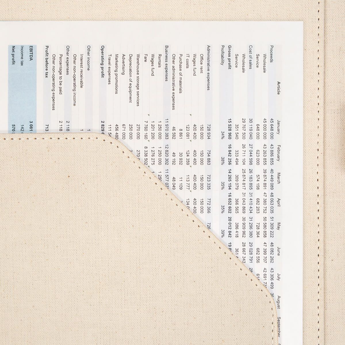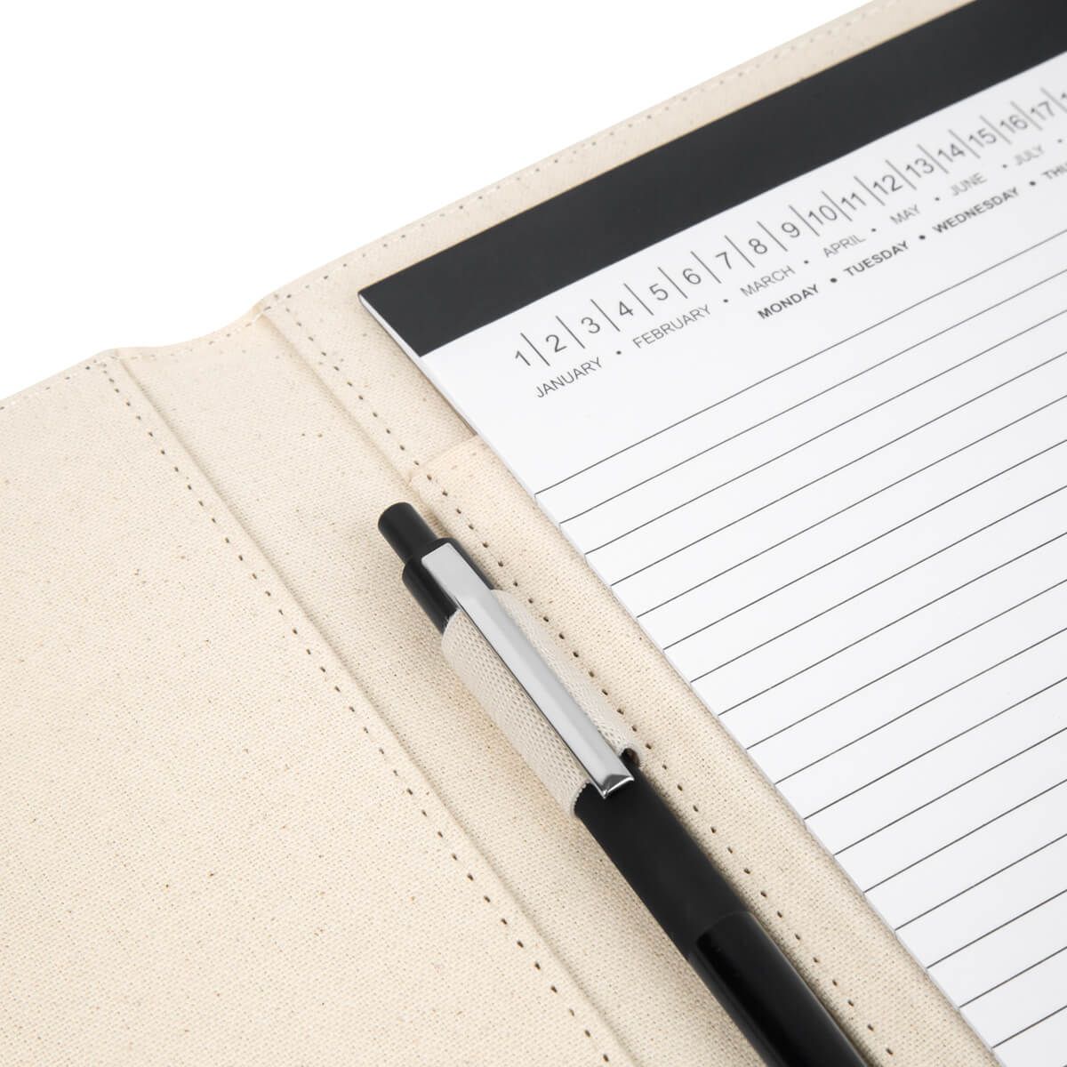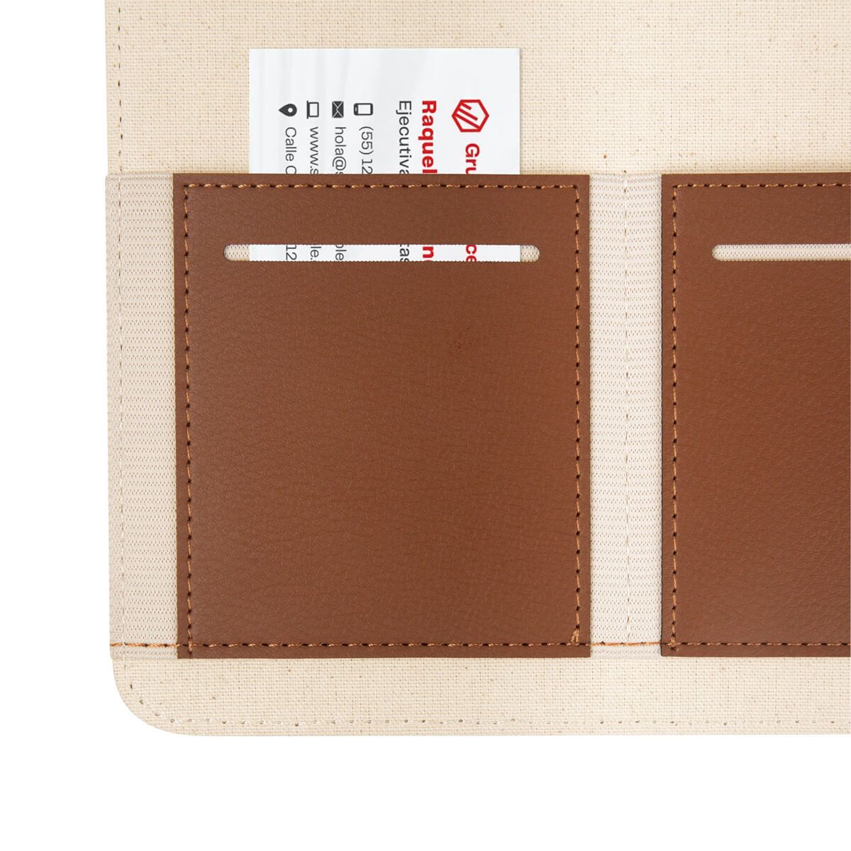 Carpeta con compartimentos para hojas y tarjetas. Incluye un block de raya tamaño A4 con 20 hojas y un elástico para sujetar un bolígrafo. No incluye bolígrafo.