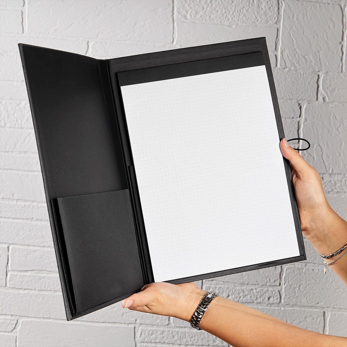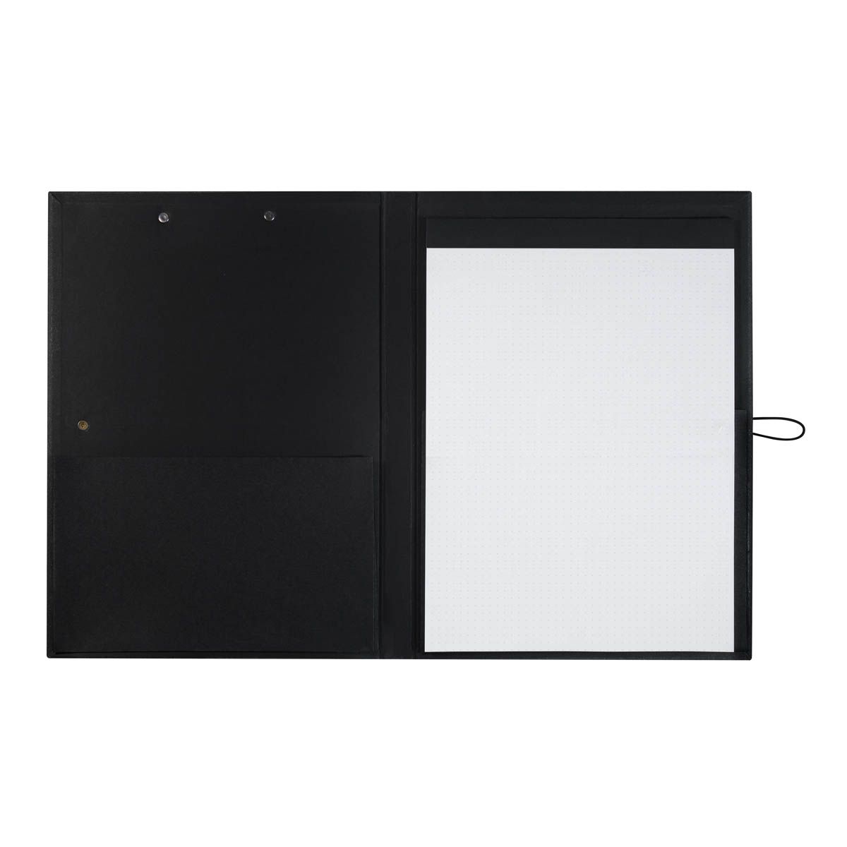 Carpeta con práctico clip metálico y soporte retráctil en la parte superior. Incluye block de 30 hojas con retícula de puntos y compartimento interno. Su elástico ayuda a mantenerla cerrada y evitar extraviar documentos. Utilizala como carpeta o como tabla para encuestas, ideal para entornos profesionales o académicos.