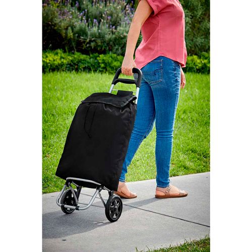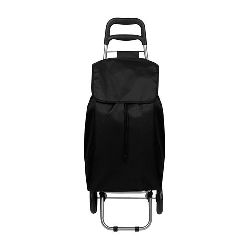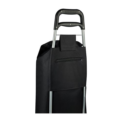 Bolsa para supermercado con jareta y solapa, bolsa posterior con cierre, estructura de metal, base para sostenerse, agarradera de plástico y llantas. Desmontable con velcro en la parte posterior.