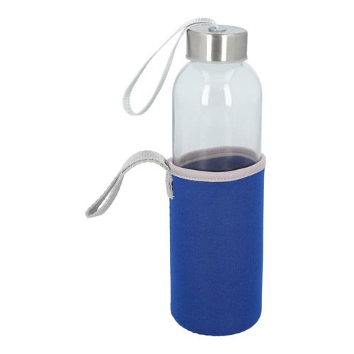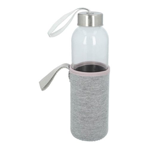 Cilindro de vidrio con tapa metálica de rosca con jareta de tela y funda removible de neopreno con asa que no permite transferir calor de las manos o del ambiente a la bebida.