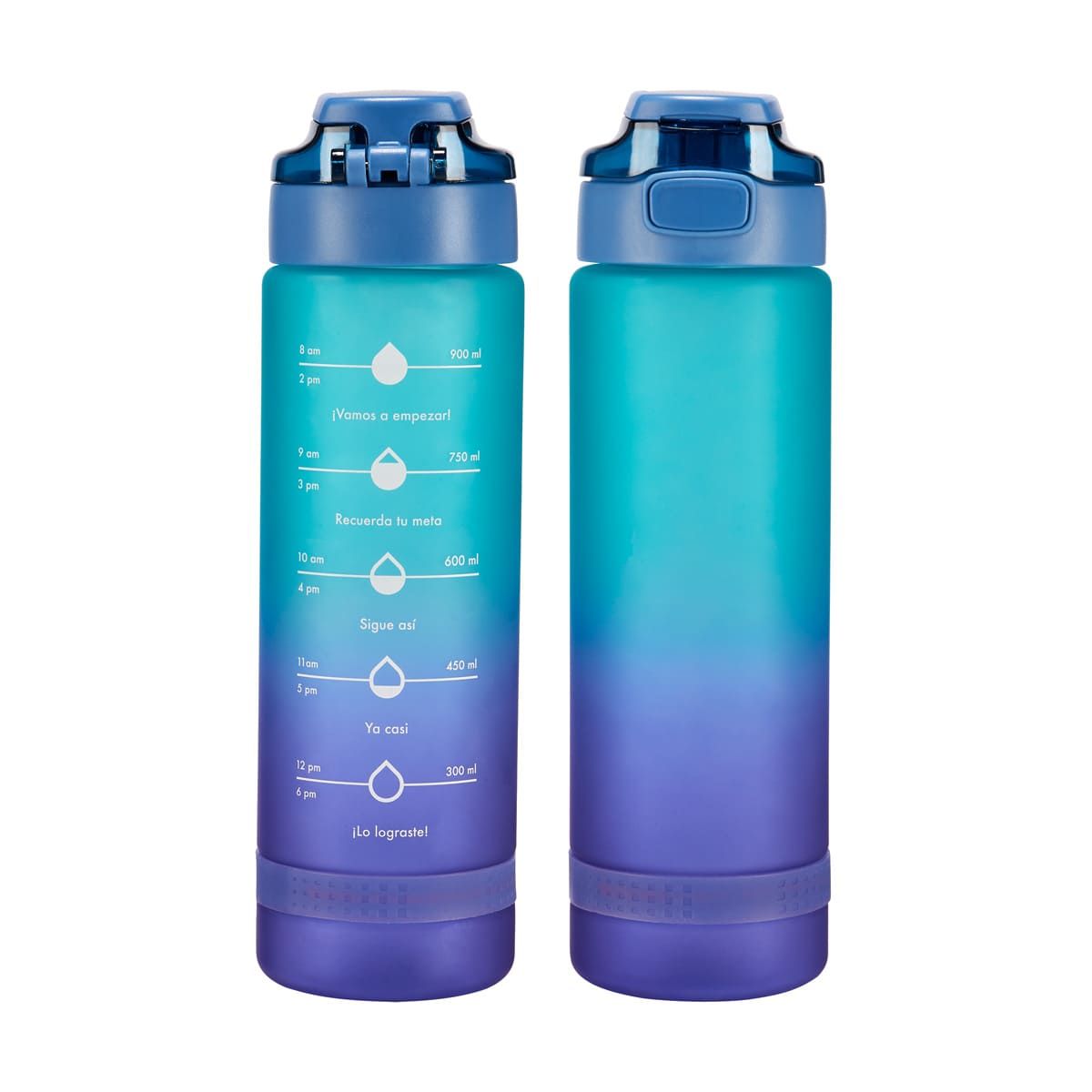 Tapa de plástico con cierre de rosca hermética y boquilla. Sobretapa push con botón y asa plegable. Cuerpo con terminado tipo rubber, suave al tacto. Cuenta con un detalle de silicón en la parte inferior. Incluye marcador de mililitros y horas lo que te permite medir fácilmente la cantidad de agua que bebes a lo largo del día y llevar un control de tu hidratación. Incluye caja individual.