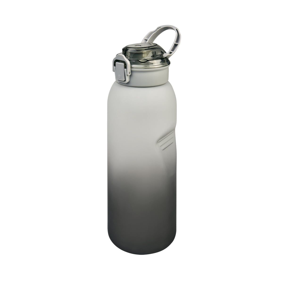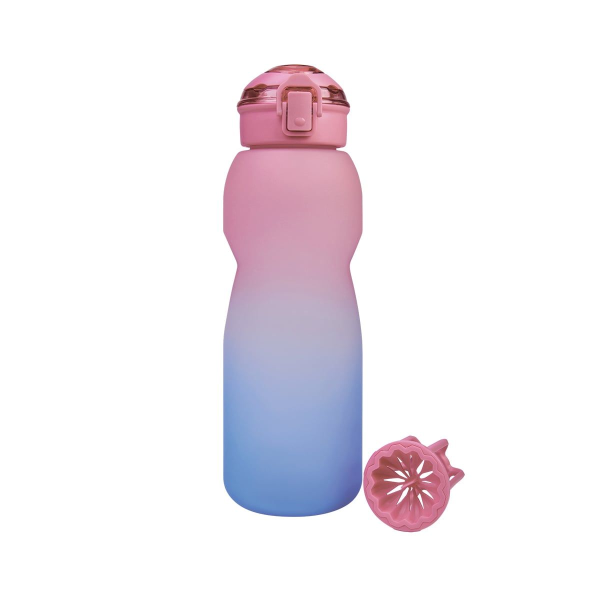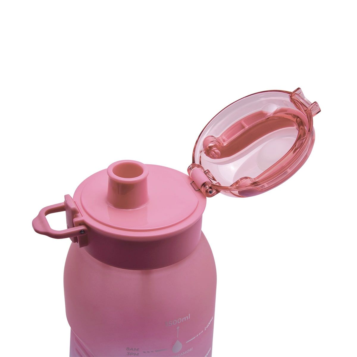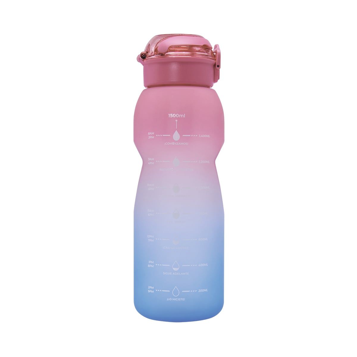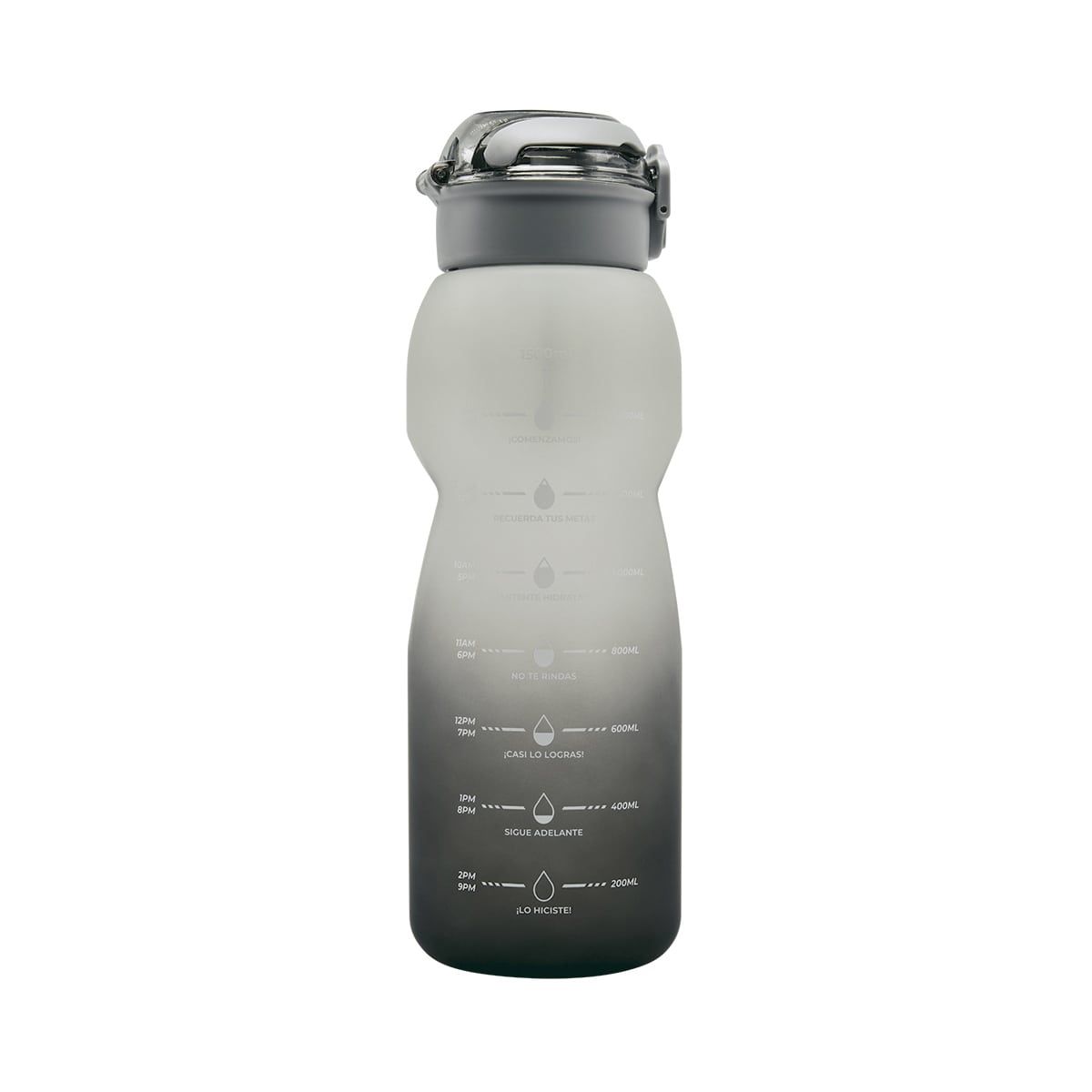 Tapa de plástico con cierre de rosca y boquilla, sobretapa push con botón de seguridad y asa plegable. Cuerpo con terminado rubber, resaques laterales para un mejor agarre, indicador de mililitros y horas para motivar y controlar tus hábitos de hidratación. Incluye filtro de plástico y caja individual.