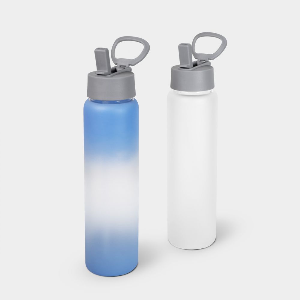 Cilindro de vidrio con terminado frosty y un recubrimiento especial para sublimar. Tapa de plástico con cierre de rosca asa y popote retráctil. Incluye caja individual.