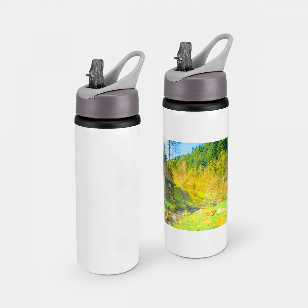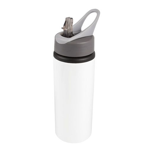 Cilindro para sublimar de aluminio de una pared. Tapa de plástico con cierre de rosca, asa y popote. Incluye caja individual.
