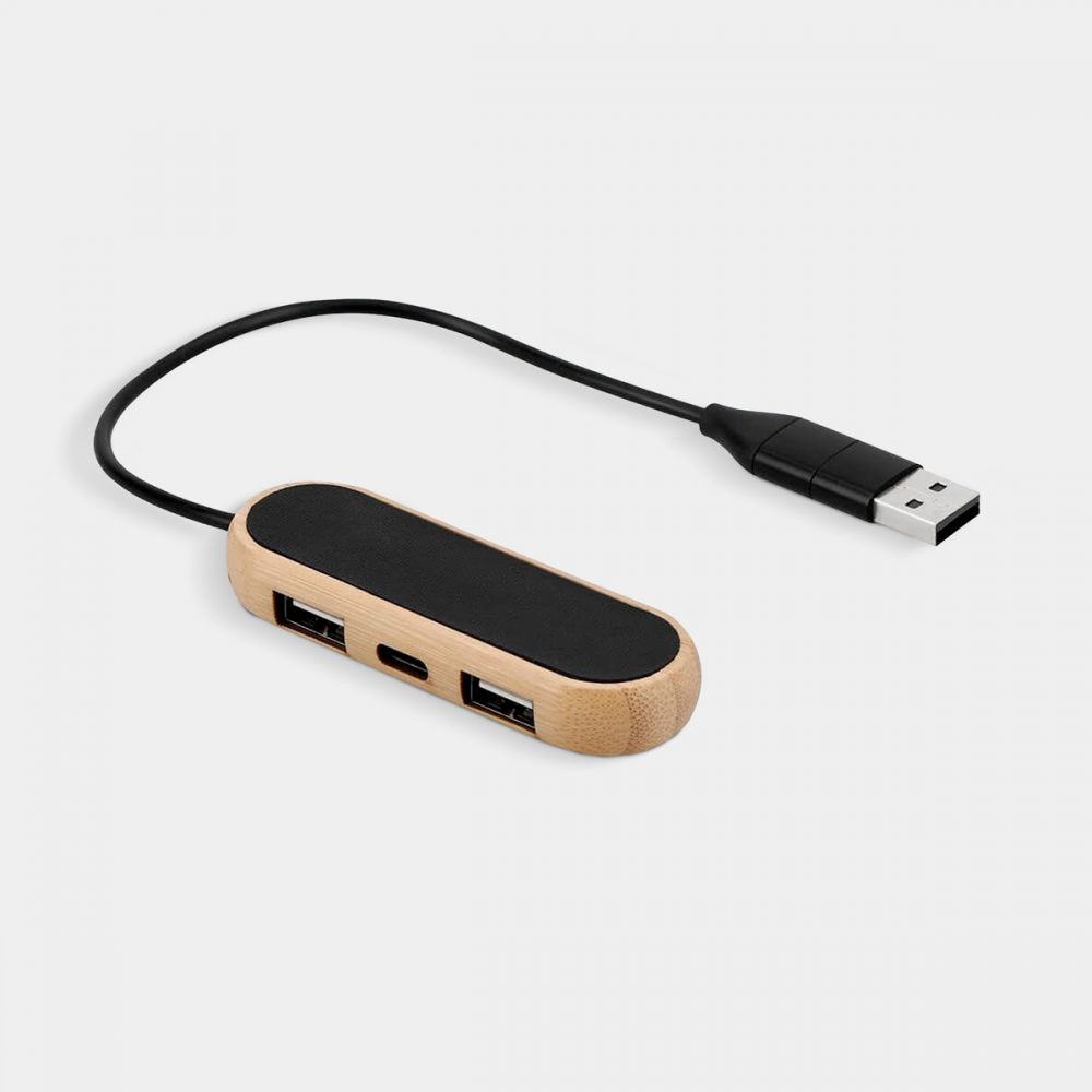 Concentrador con 2 puertos USB 2.0 y 1 puerto tipo C. Soporta transferencia de datos. Cable de conexión con USB y tipo C. El bambú es un producto natural el cual puede presentar variaciones en tonalidades y vetas.