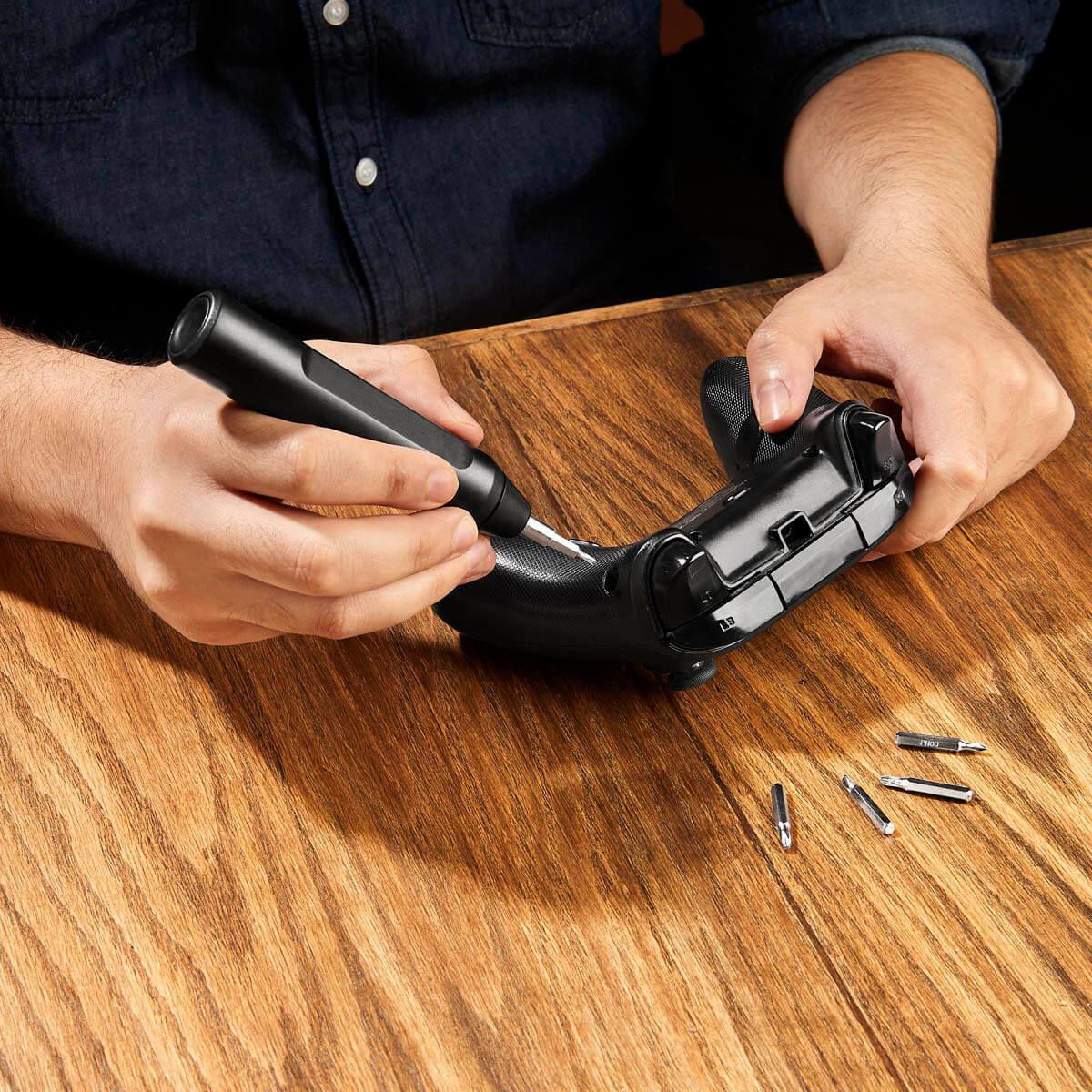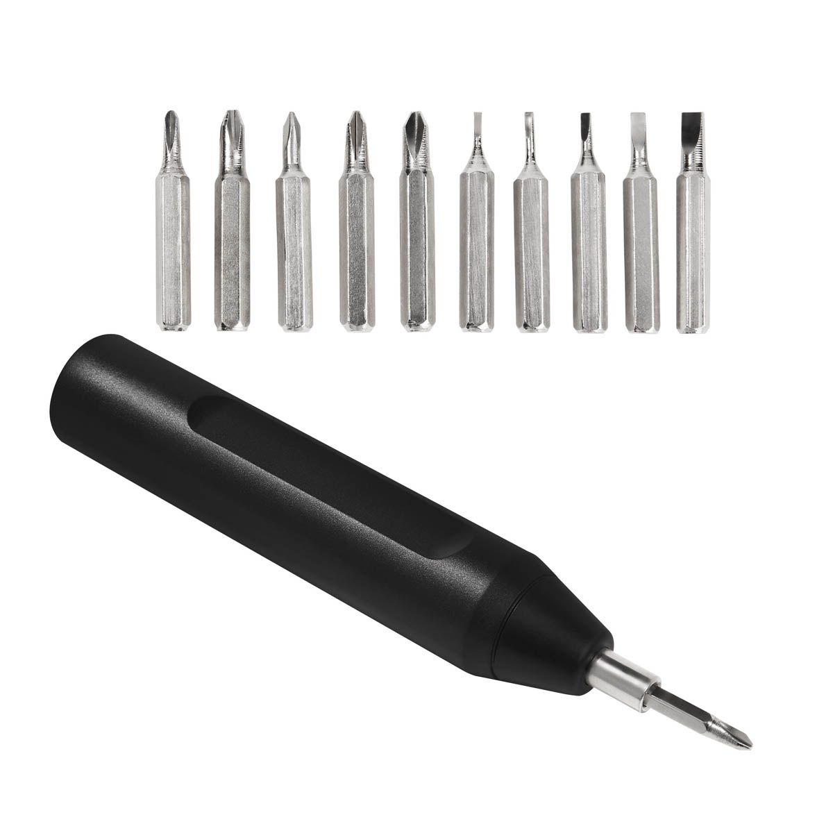 Desarmador con 10 puntas intercambiables. Incluye 5 puntas de cruz y 5 planas, organizadas en un compartimento interno que las mantiene seguras y al alcance de tu mano. Su innovador sistema push para abrir y cerrar asegura que las puntas permanezcan en su lugar, evitando pérdidas y facilitando su uso.