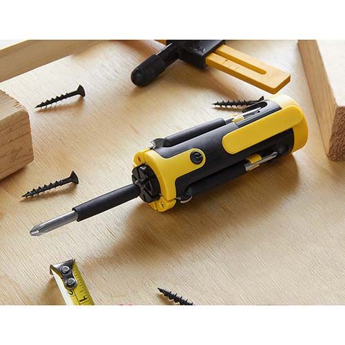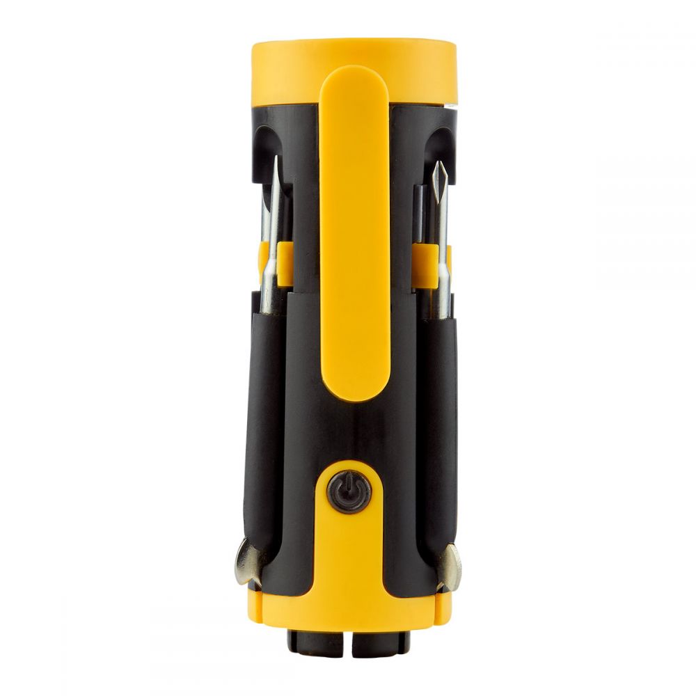 Contiene desarmador con clip, 6 puntas diferentes, 4 LEDS utiliza 2 baterías AAA (no incluidas).