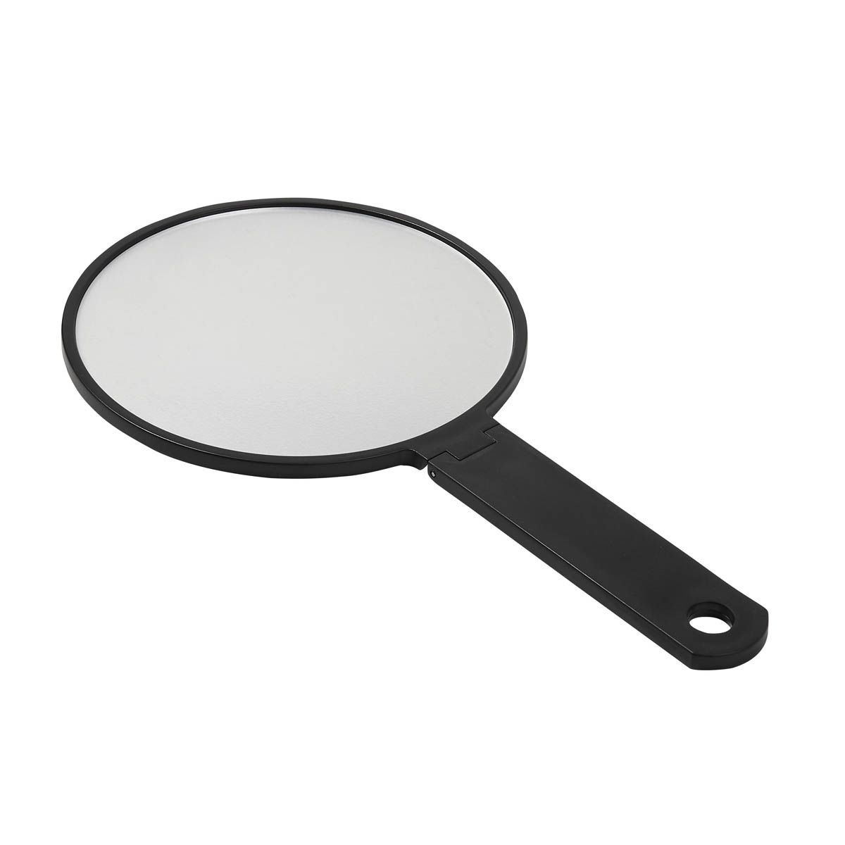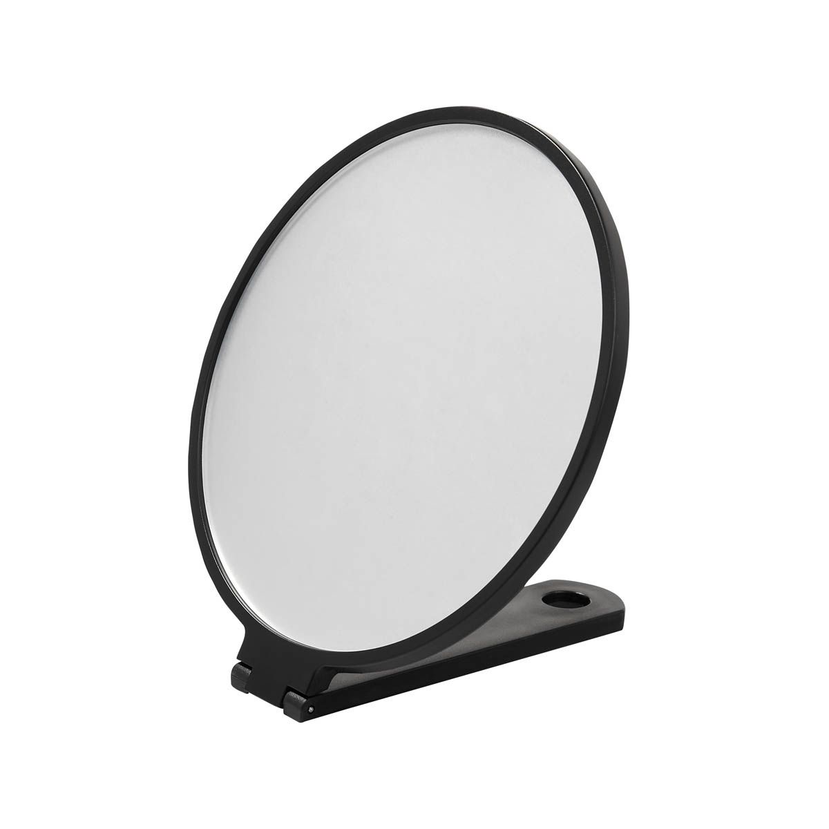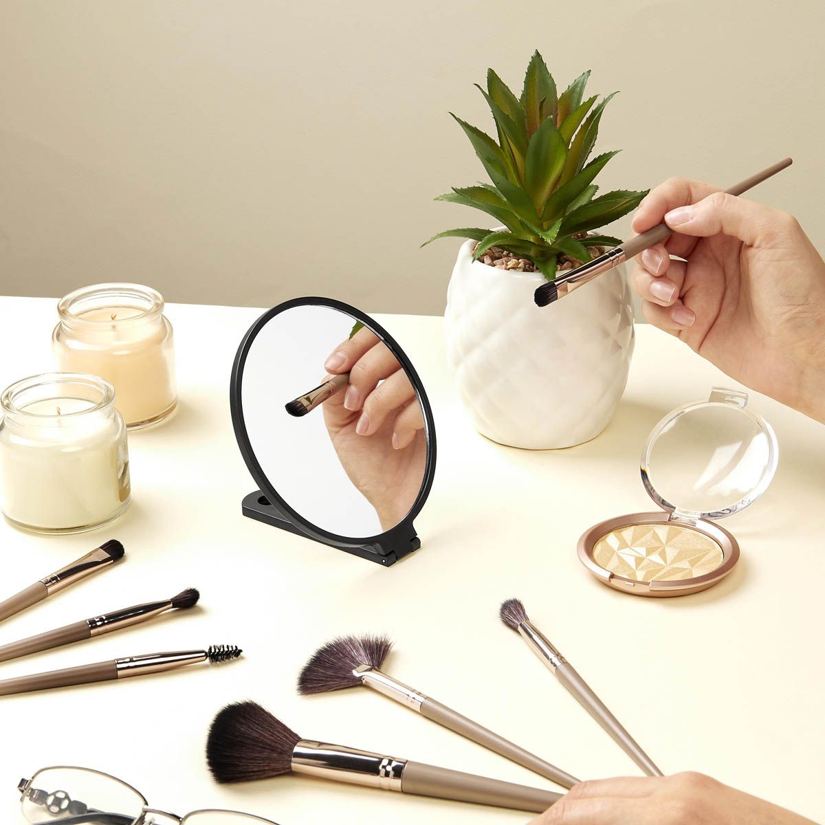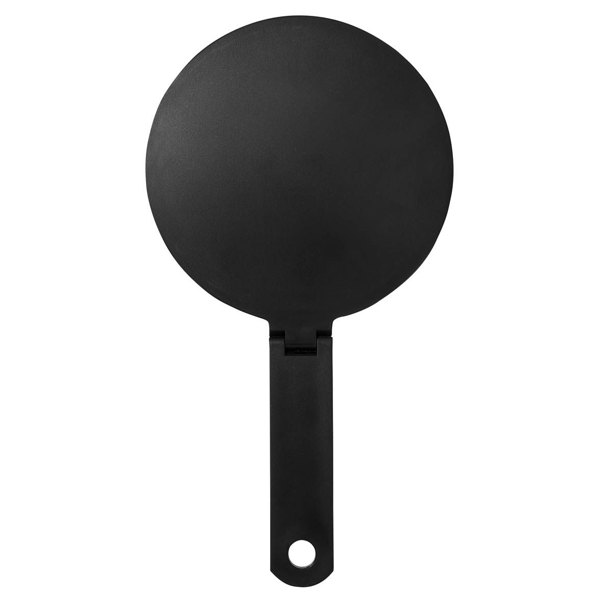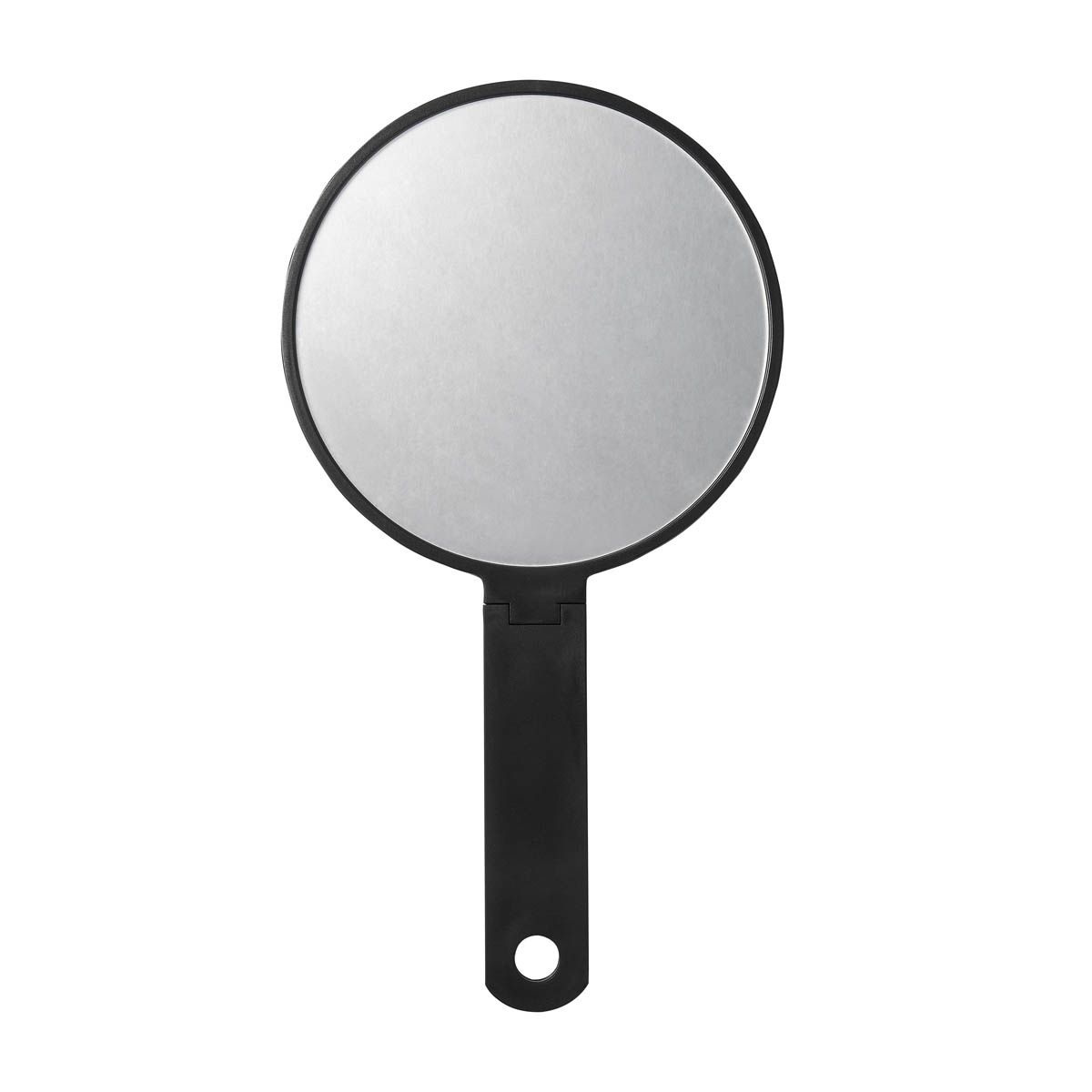 Espejo circular de mano con asa plegable. Su asa multifuncional se convierte en soporte y tiene un orificio para colgarlo fácilmente donde lo requieras.