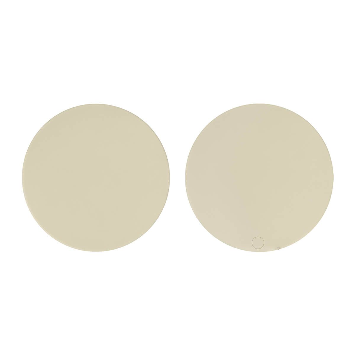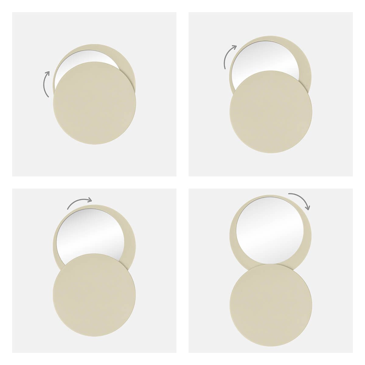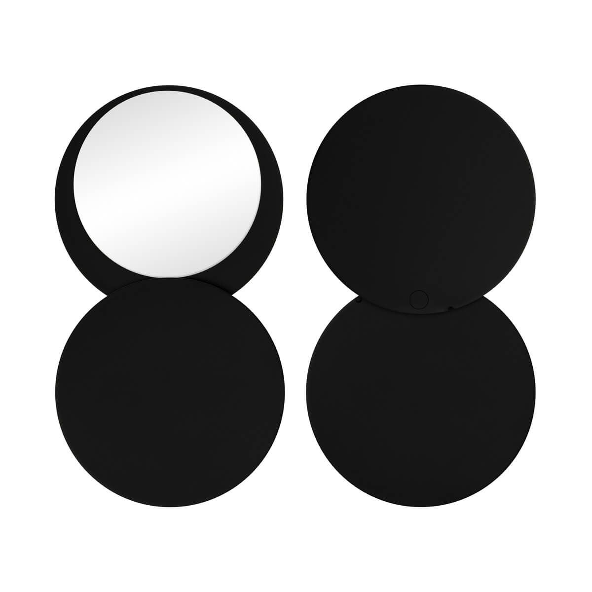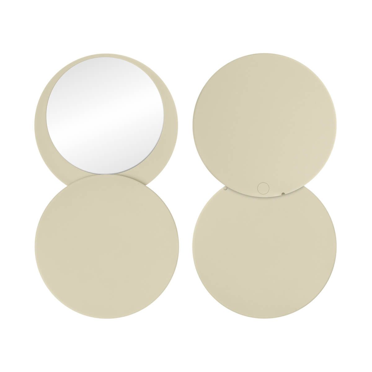 Espejo circular compacto suave al tacto. Incluye una tapa giratoria deslizable que protege el espejo mientras no lo usas. Perfecto para retoques rápidos o como un esencial en tu bolsa de viaje.