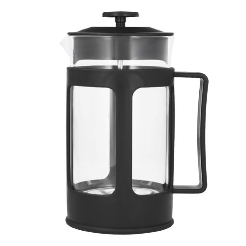 Cafetera de cristal tipo francés con base y tapa de plástico, filtro de acero inoxidable.