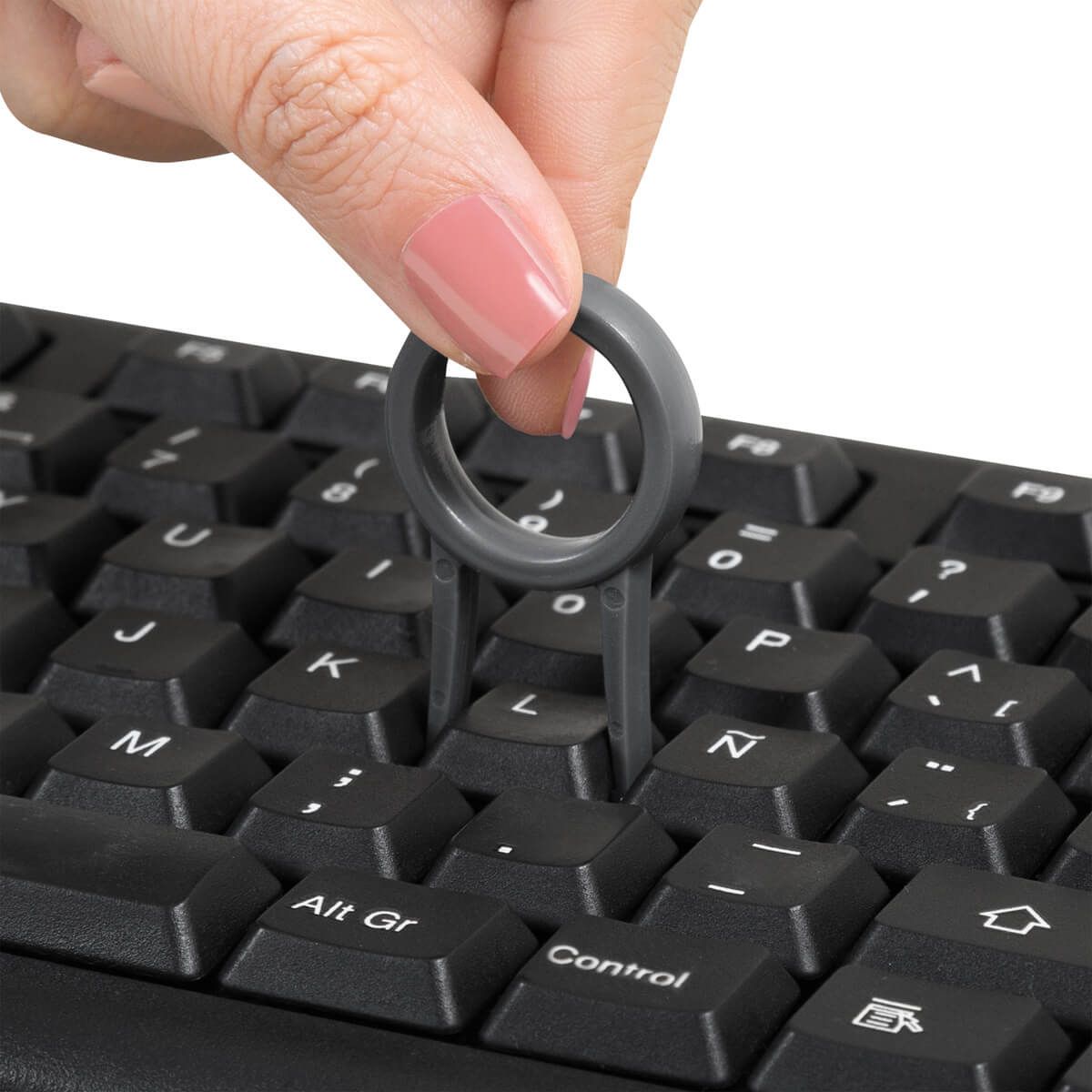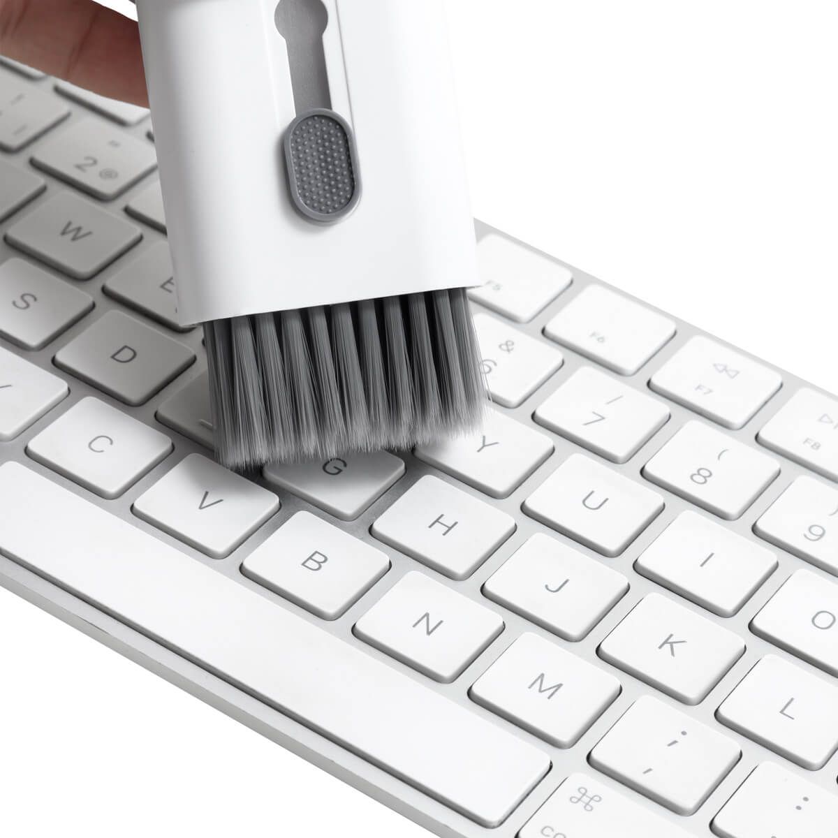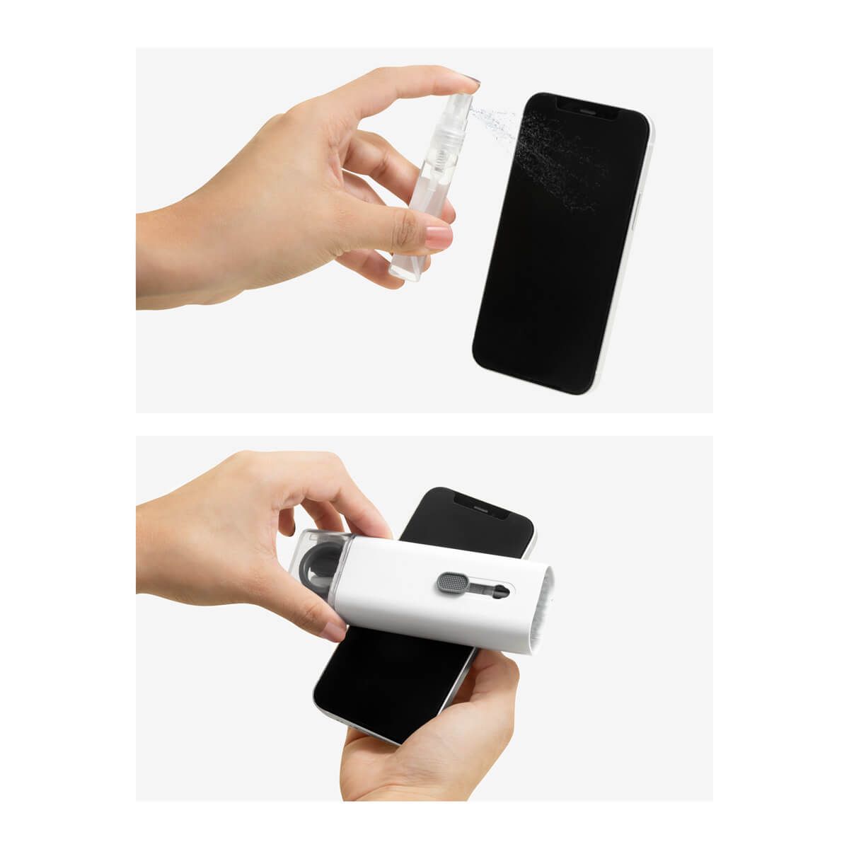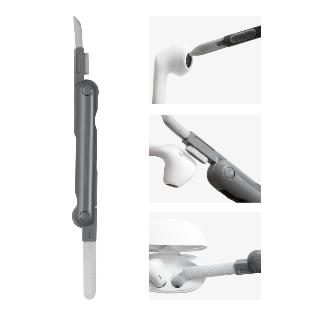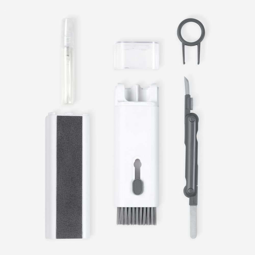 Kit de limpieza para electrónicos, gadgets, celulares y más. Incluye 5 herramientas básicas para mantener tus accesorios favoritos libres de suciedad. Cepillo plegable 3 en 1 para limpiar aurículares. Equipado con punta de silicón, cepillo de esponja y mini cepillo. Mini atomizador de 5ml con líquido limpiador de pantallas. Removedor de teclas (para teclado mecánico). Cepillo retráctil para limpiar teclados o superficies planas. Limpiador de pantallas y caja individual.