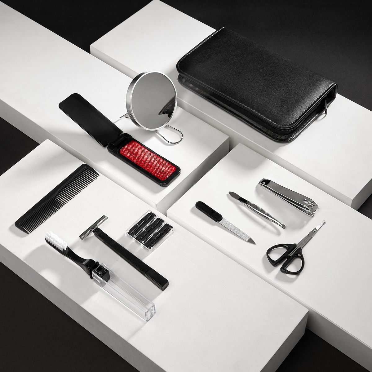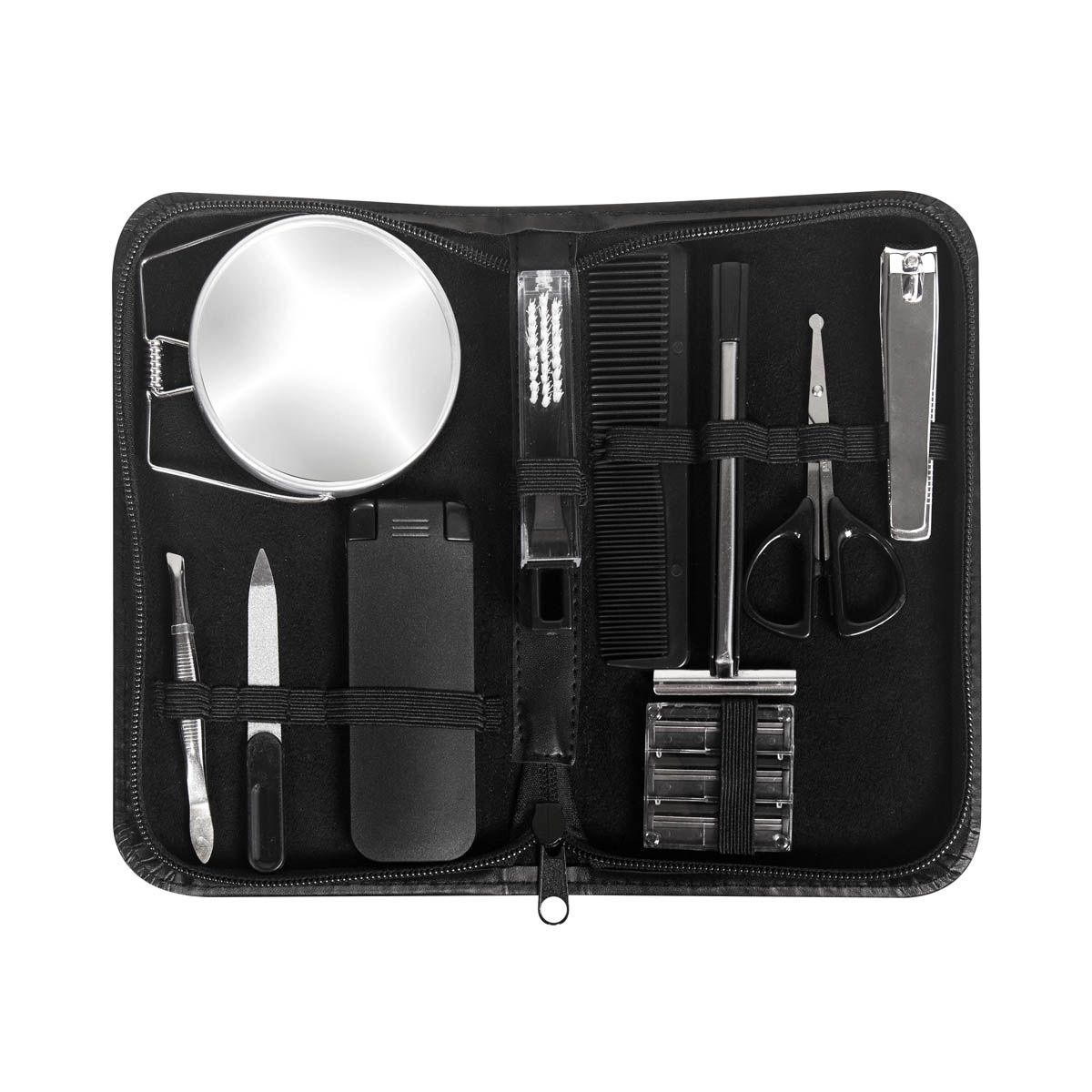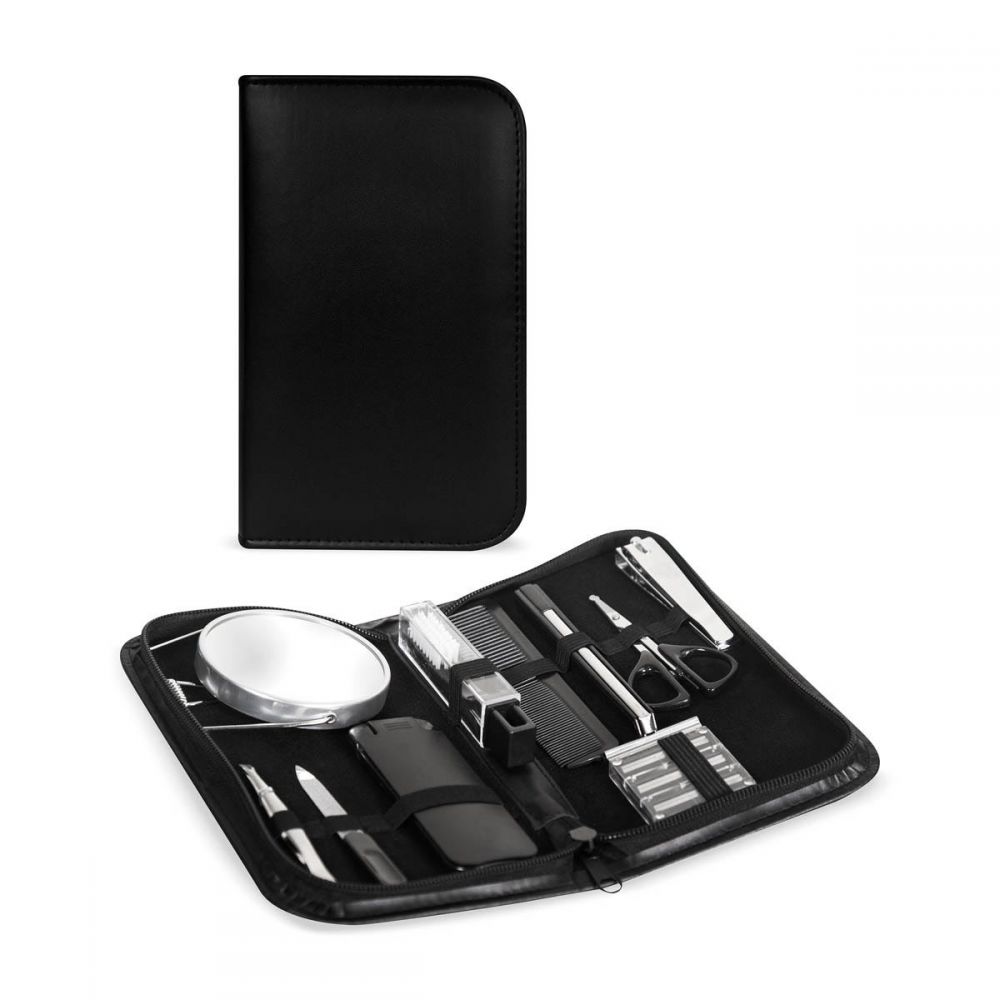 Set de cuidado personal. Ideal para tus viajes, mantente impecable en cualquier momento. Incluye los siguientes 10 accesorios: espejo, lima, cortaúñas, pinzas, tijeras, peine, cepillo dental, rastrillo con 3 navajas de repuesto y un calzador plegable con limpiador de calzado.