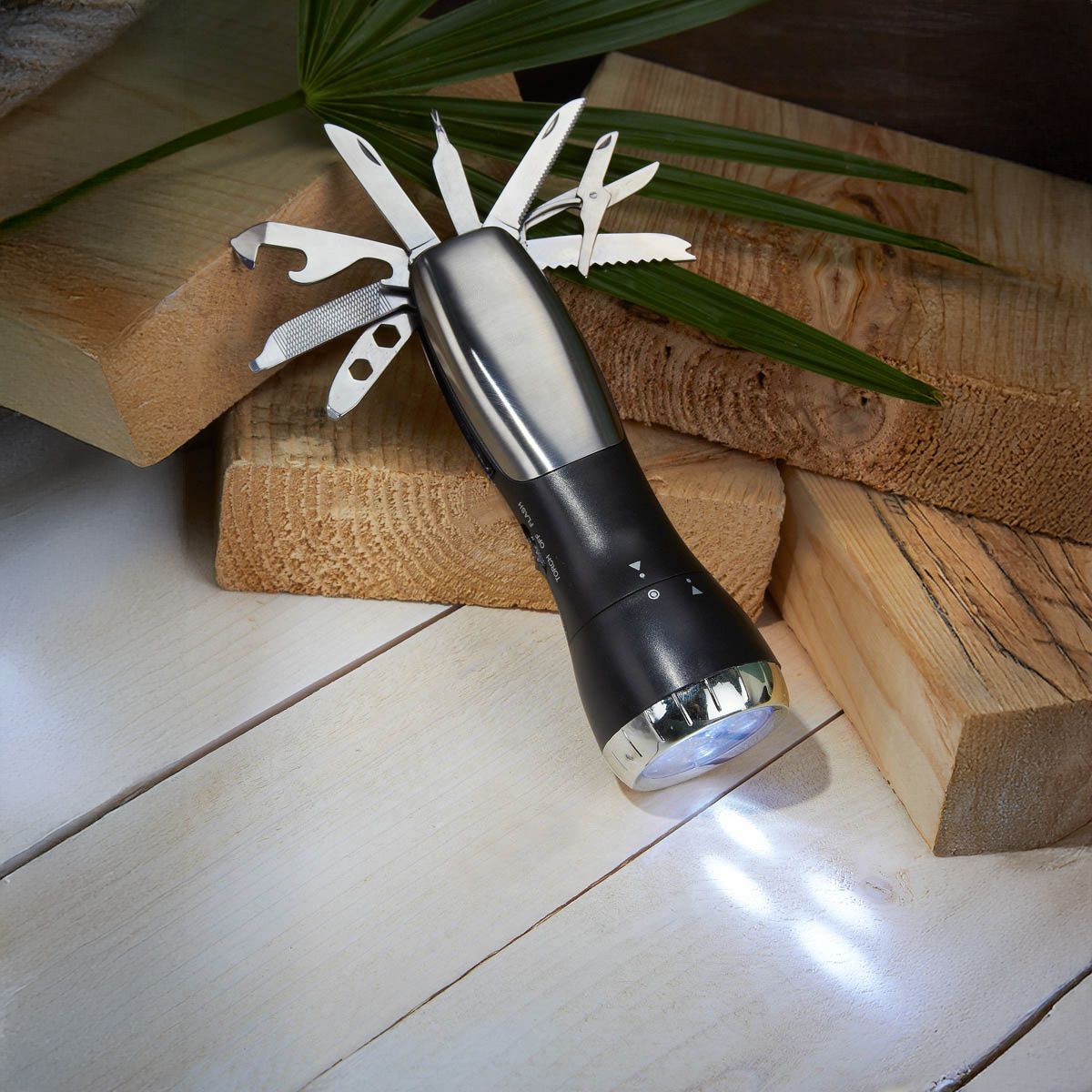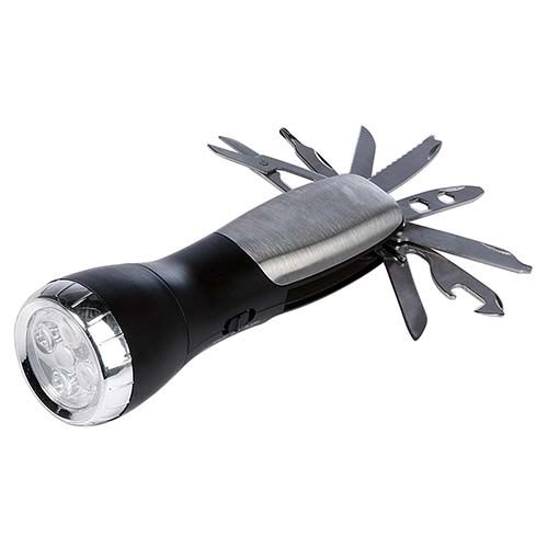 Lámpara de 4 LEDS con flash. Incluye destapador, tijeras y 6 diferentes navajas con distintas funciones. Incluye 3 baterías AAA.