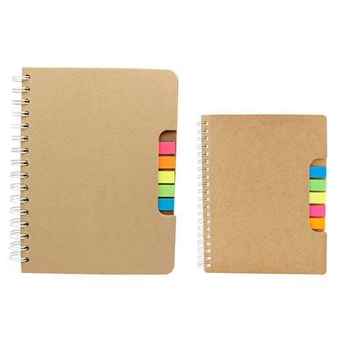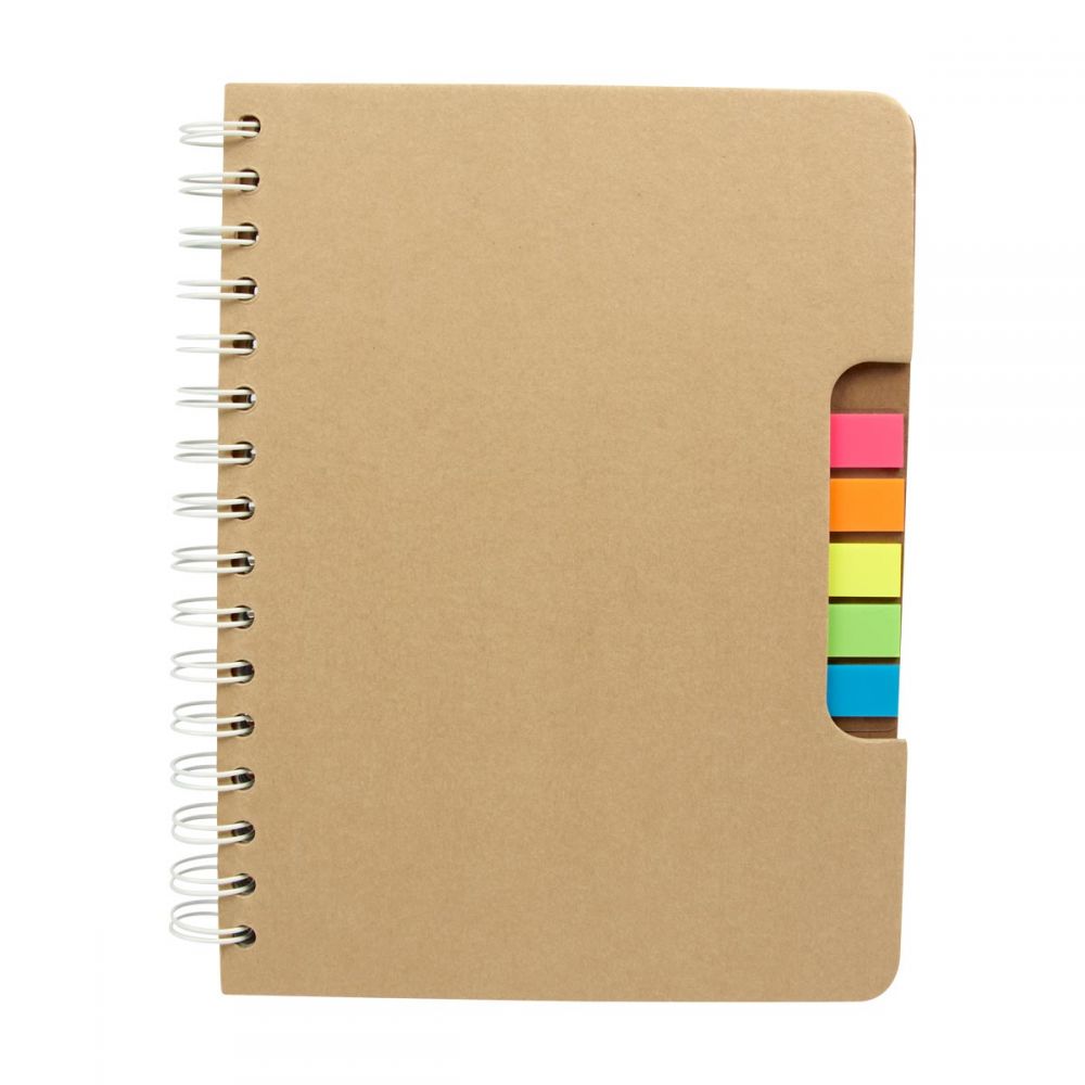 Libreta con 100 hojas de raya. Incluye banderillas adheribles en 5 colores, bolígrafo ecológico y espiral metálico doble.