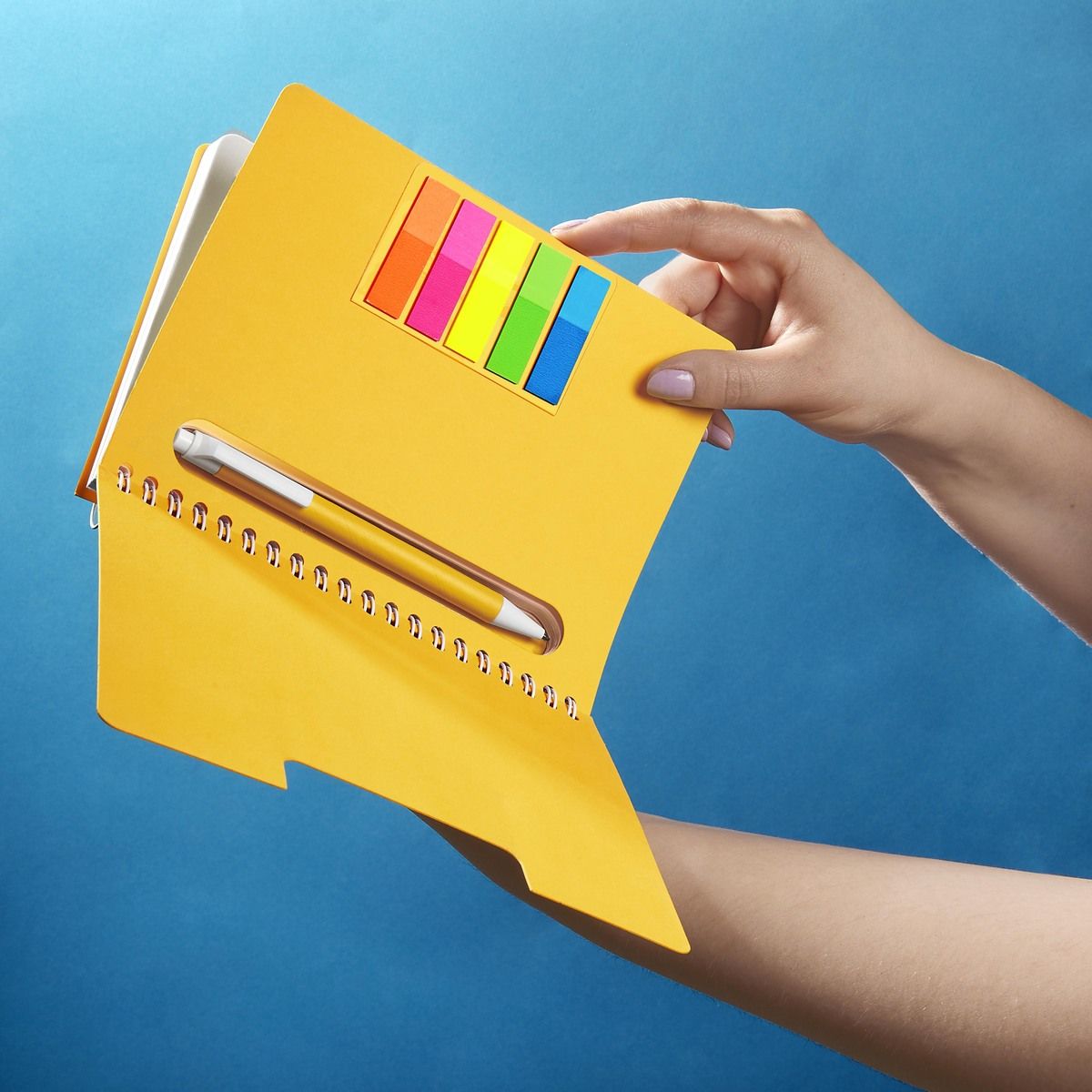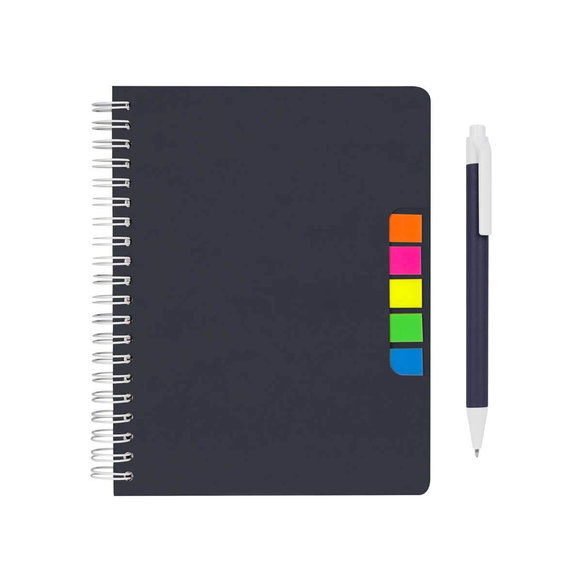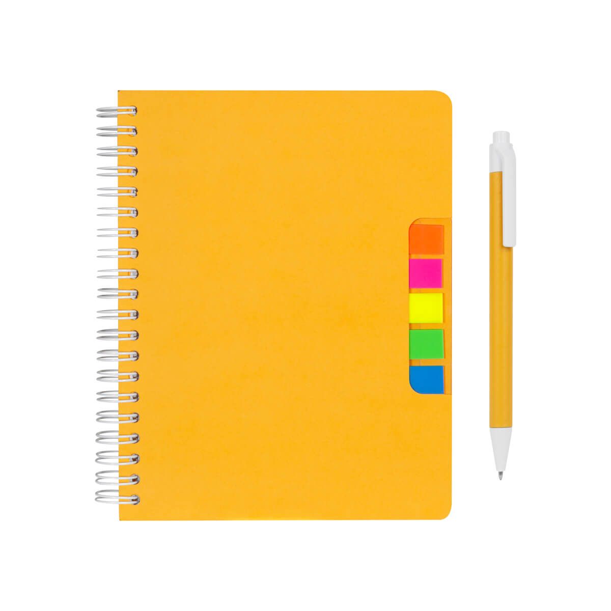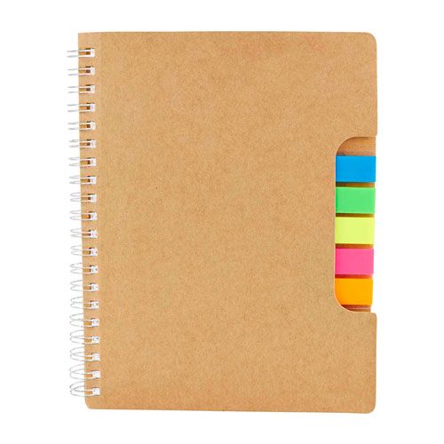 Libreta con 70 hojas de raya. Incluye banderillas adheribles de diferentes colores, bolígrafo ecológico y espiral metálico doble.