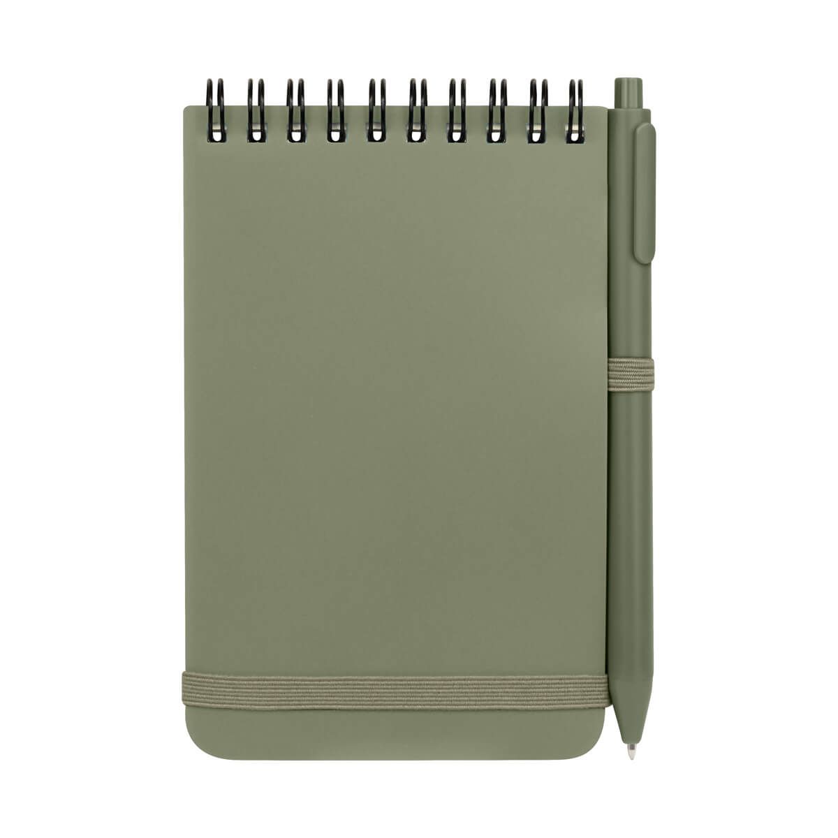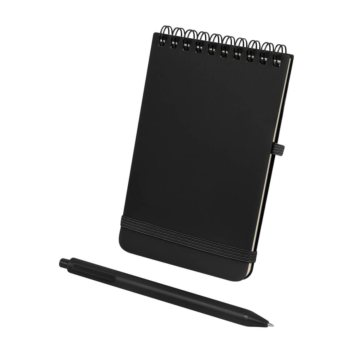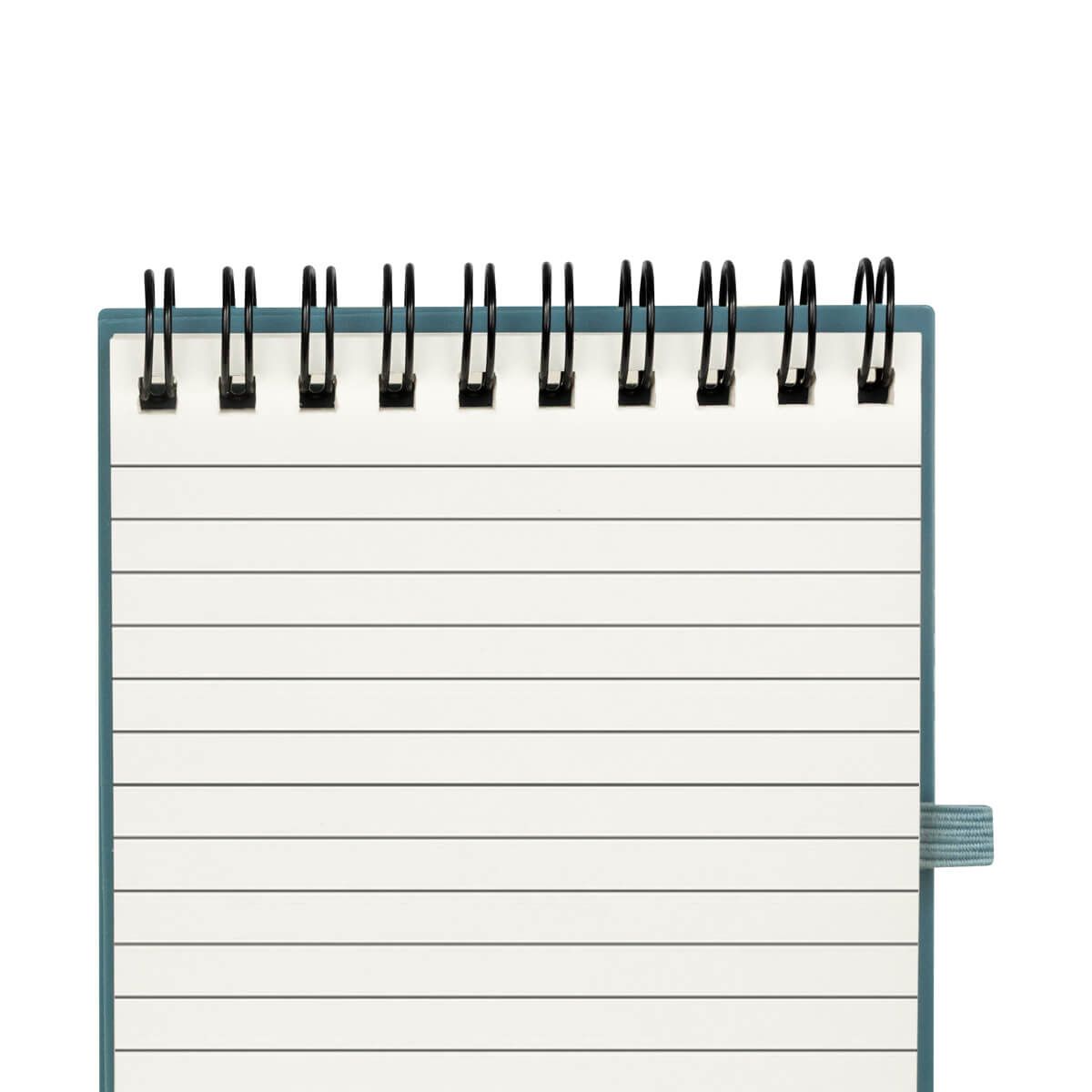 Libreta de bolsillo con 60 hojas a rayas. Cubierta de plástico y cierre elástico. Incluye bolígrafo de plástico con sistema push. Su espiral y formato vertical la hace una opción práctica para notas diarias eficientes.