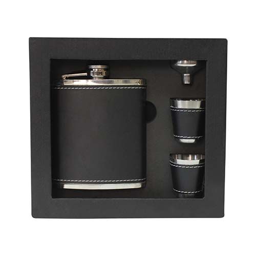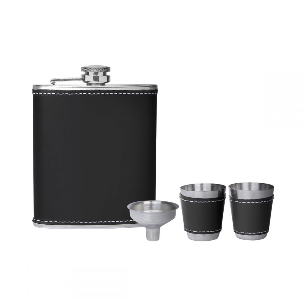 Set de licorera con tapa de rosca para evitar derrames, 2 vasos metálicos con manga de curpiel, 1 embudo y caja de regalo.