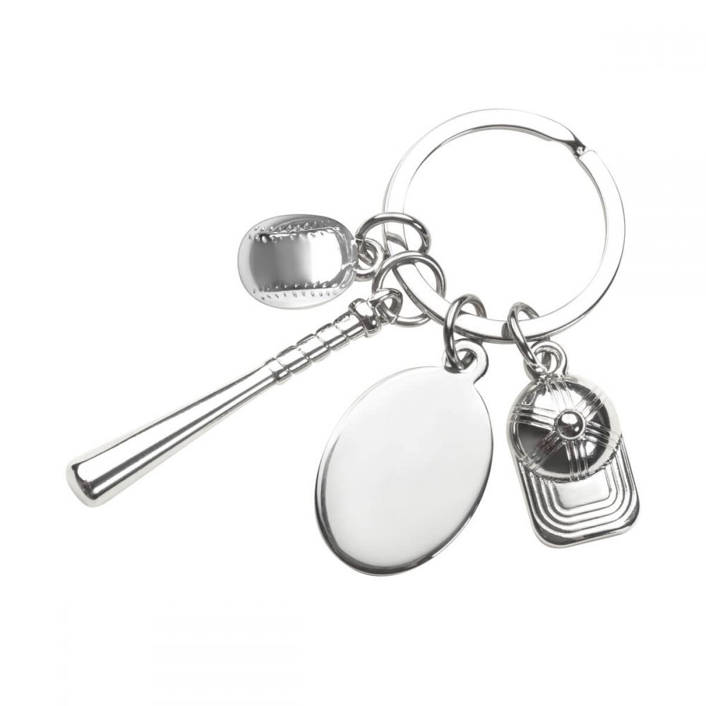 Llavero metálico con placa para grabado. Incluye 3 dijes con diseño de: bate, pelota y gorra. Este llavero es ideal para los apasionados del béisbol. Incluye caja individual.
