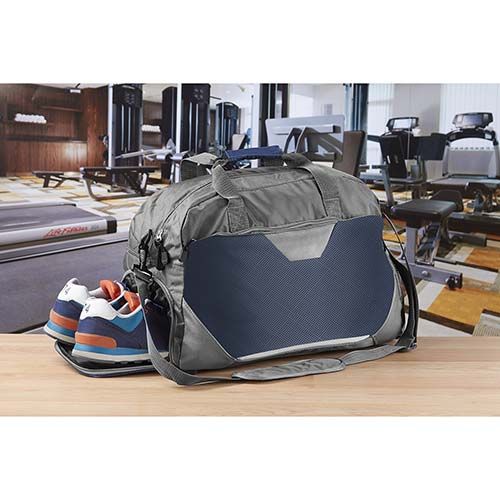Bolsa principal con cierre, bolsa frontal. Compartimento lateral para zapatos y bolsa lateral. Incluye correa para hombro ajustable con broches de plástico y asas superiores.