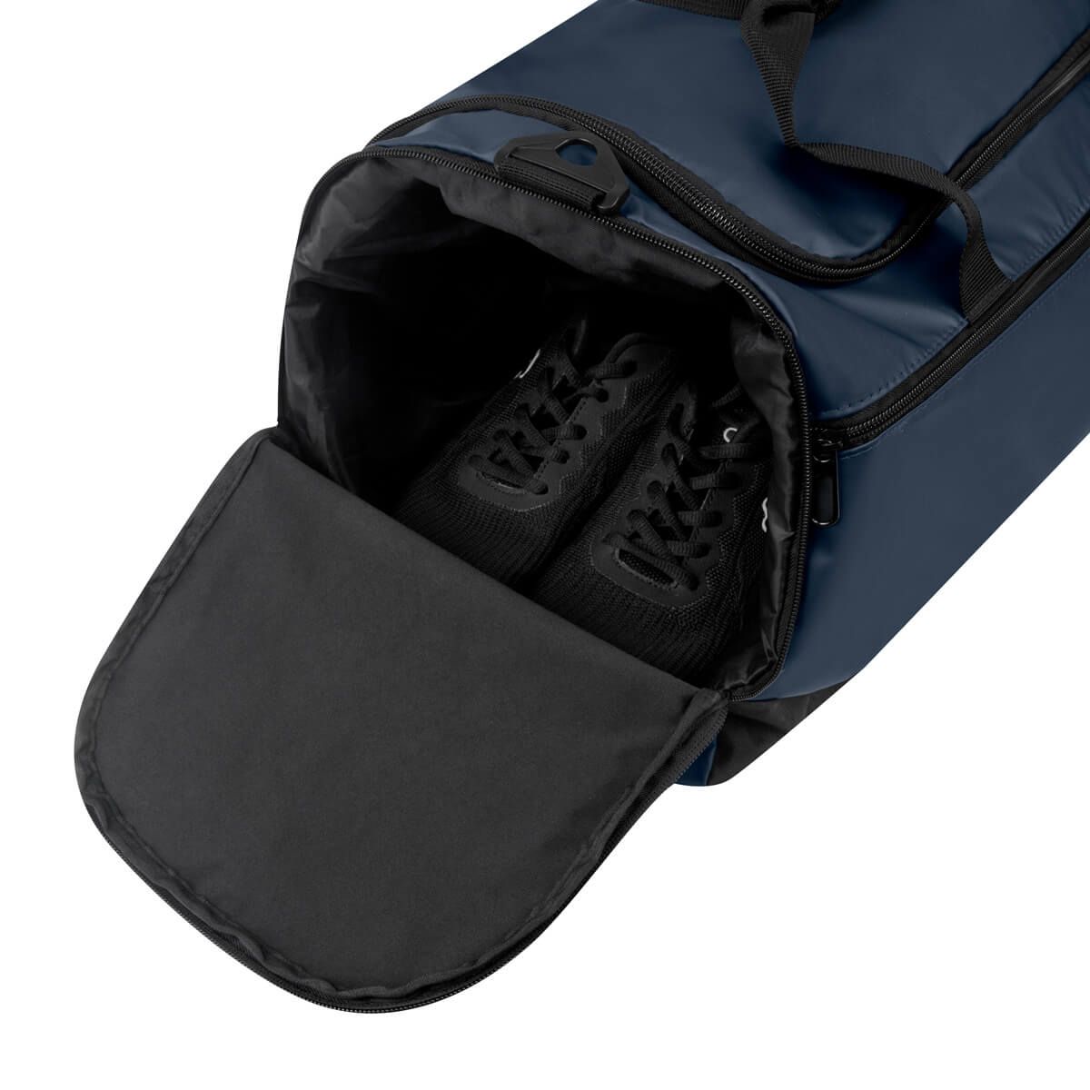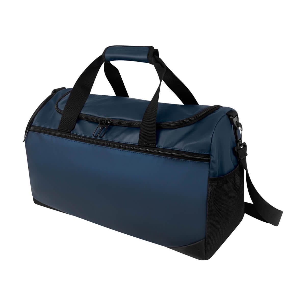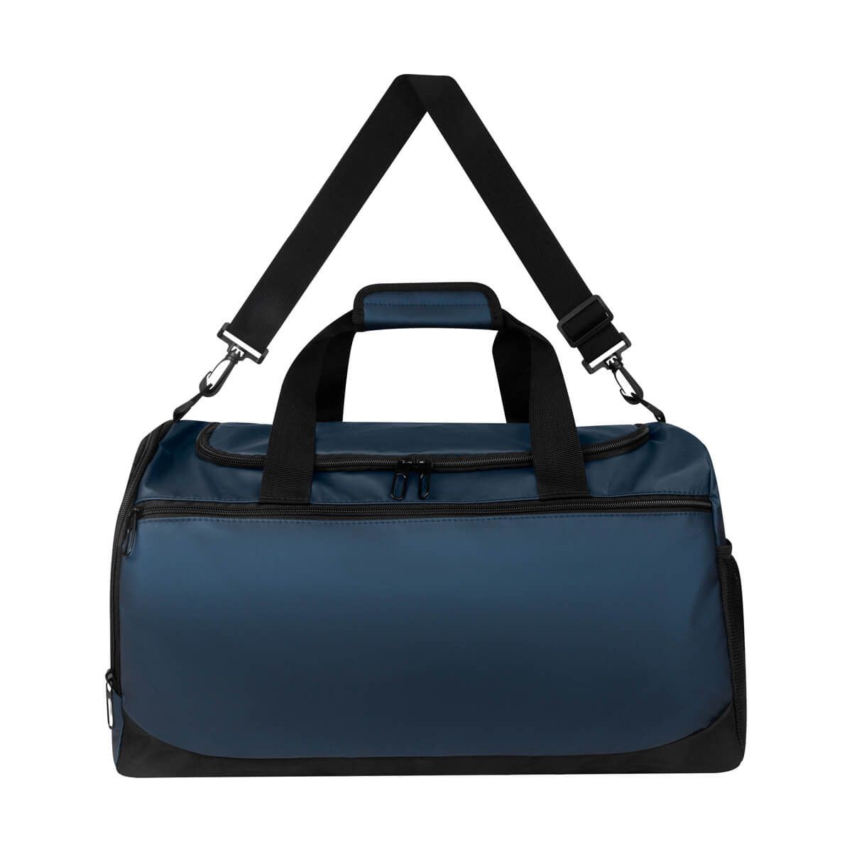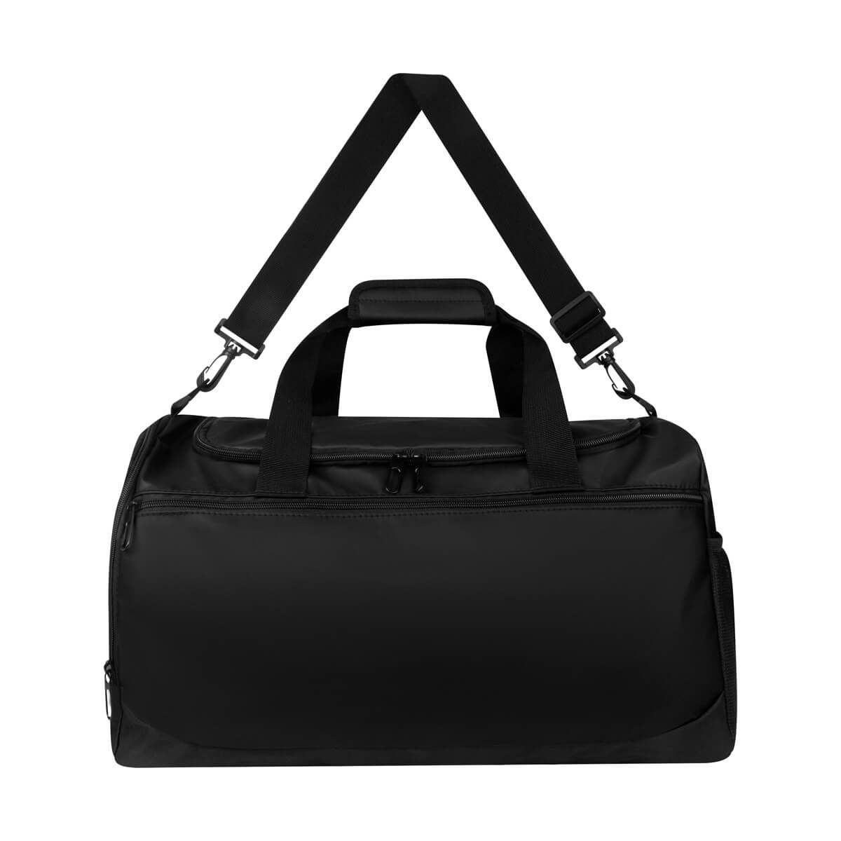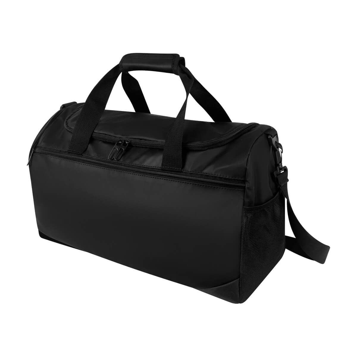 Práctica maleta con amplio compartimento principal y un bolsillo frontal con cierre. Cuenta con un compartimento lateral para calzado y un bolsillo lateral de malla para objetos pequeños. Incluye correa ajustable para hombro con broches de plástico removibles y asas de agarre superior. Perfecta para uso deportivo o viajes cortos