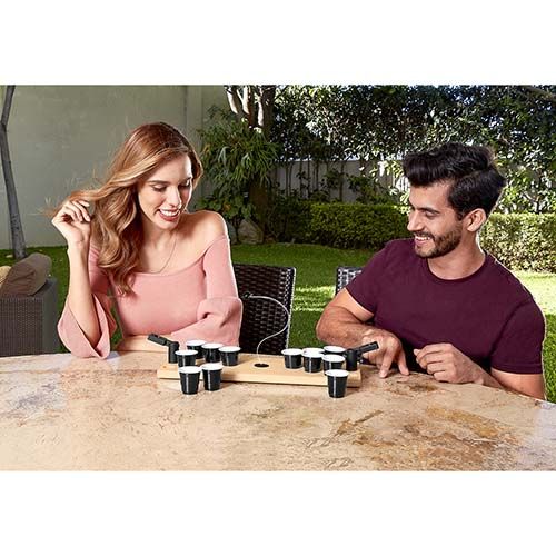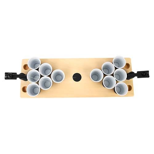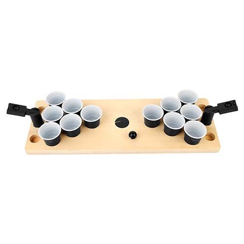 Juego mini beerpong. Incluye 12 vasos de plástico rígido y sistema de catapultas con pelota. La madera es un producto natural el cual puede presentar variaciones en tonalidades y vetas.