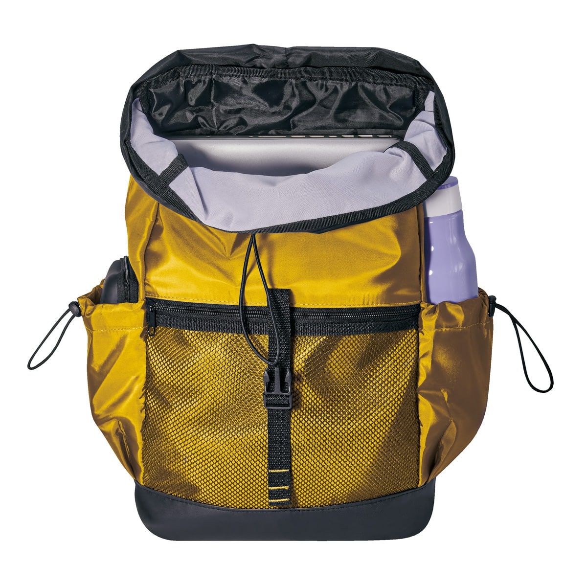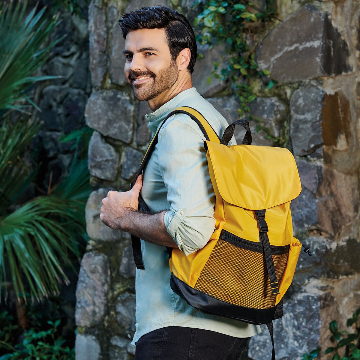 Solapa frontal con gancho y correa ajustable. Bolsa principal con cierre. Bolsa frontal de red con cierre. Compartimento para laptop de 14". Bolsillos laterales con jareta. Tirantes ajustables y correa de agarre superior.