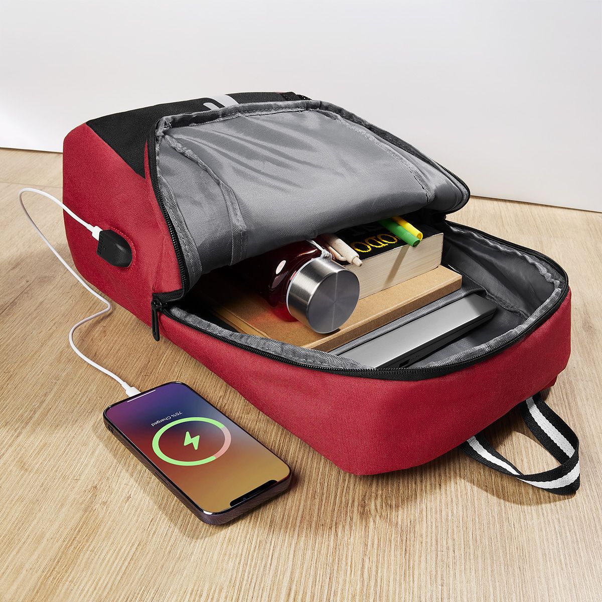 Mochila con salida USB (se requiere conectar a batería portátil) para cargar smartphone. Compartimento principal para laptop 16". Bolsillo interno para organizar accesorios. Incluye bolsillo lateral de red y aditamento especial para colocar en trolley.