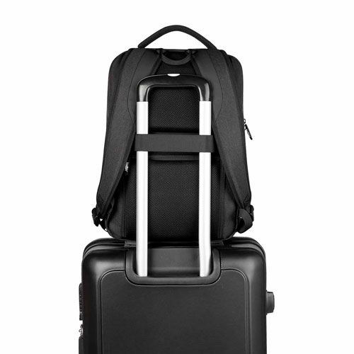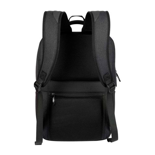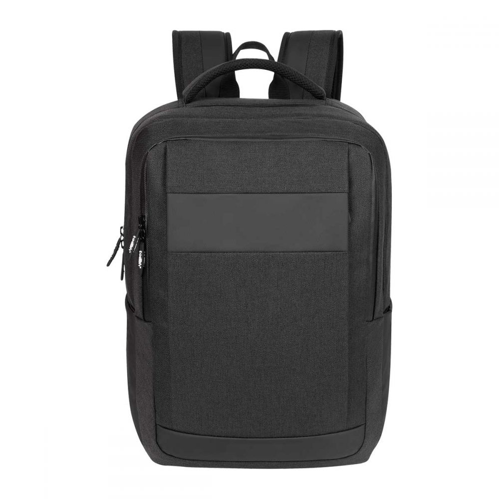 Bolsa principal con espacio para laptop de 14" y tablet. Compartimento con organizador. Bolsa frontal con cierre. 2 Bolsas laterales. Aditamento especial trasero para poner en trolley. Compartimento con cierre oculto en la parte posterior. Respaldo y tirantes acojinados.
