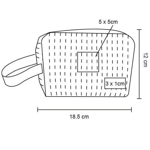 Cosmetiquera de poliuretano con interior forrado, cierre y correa.