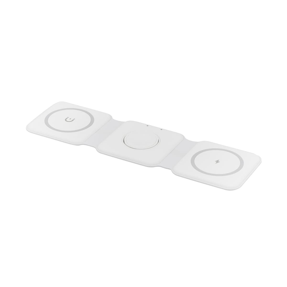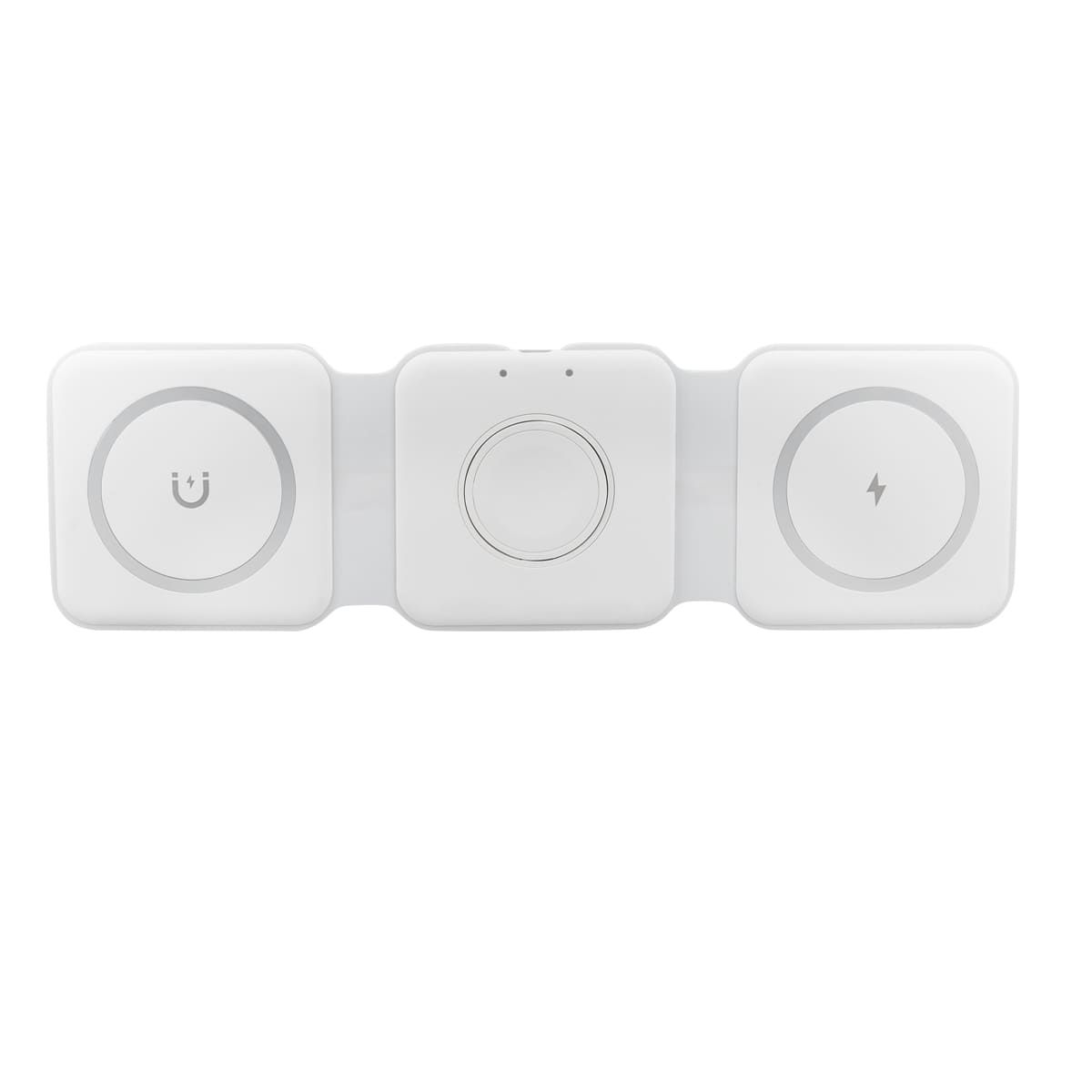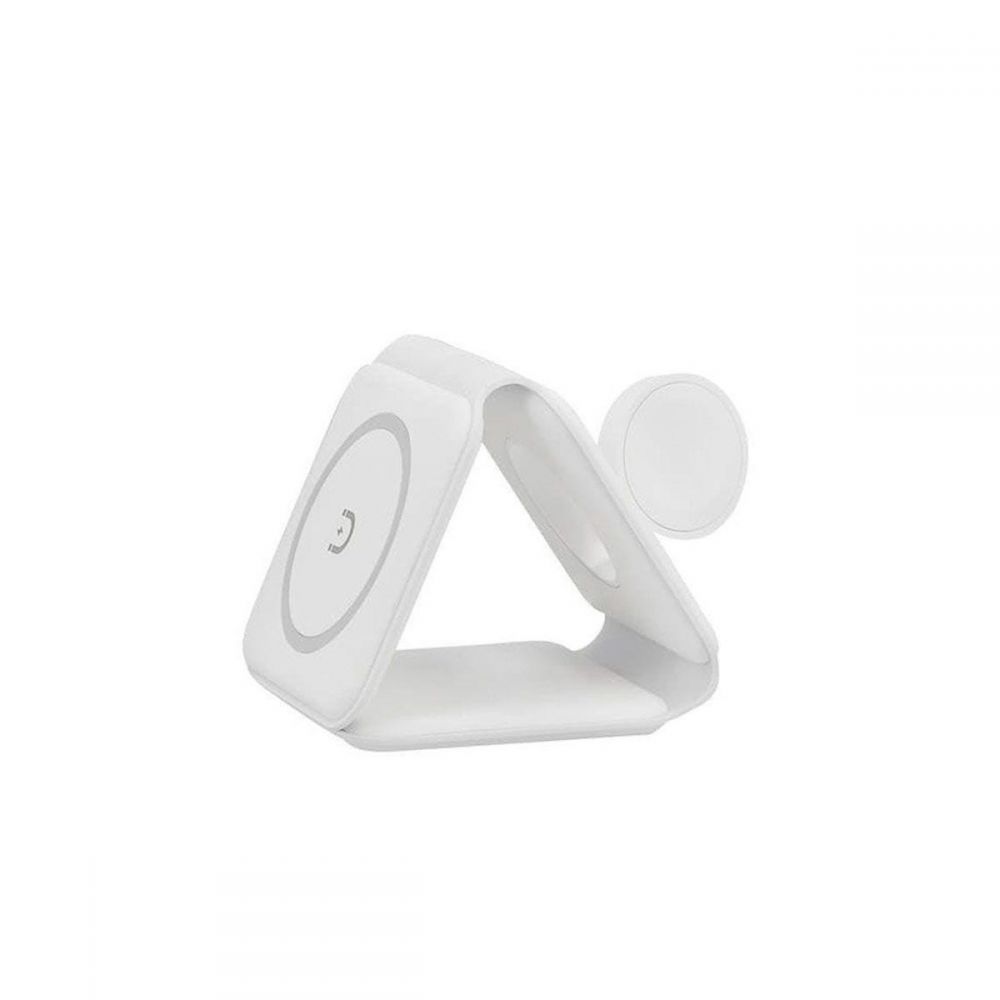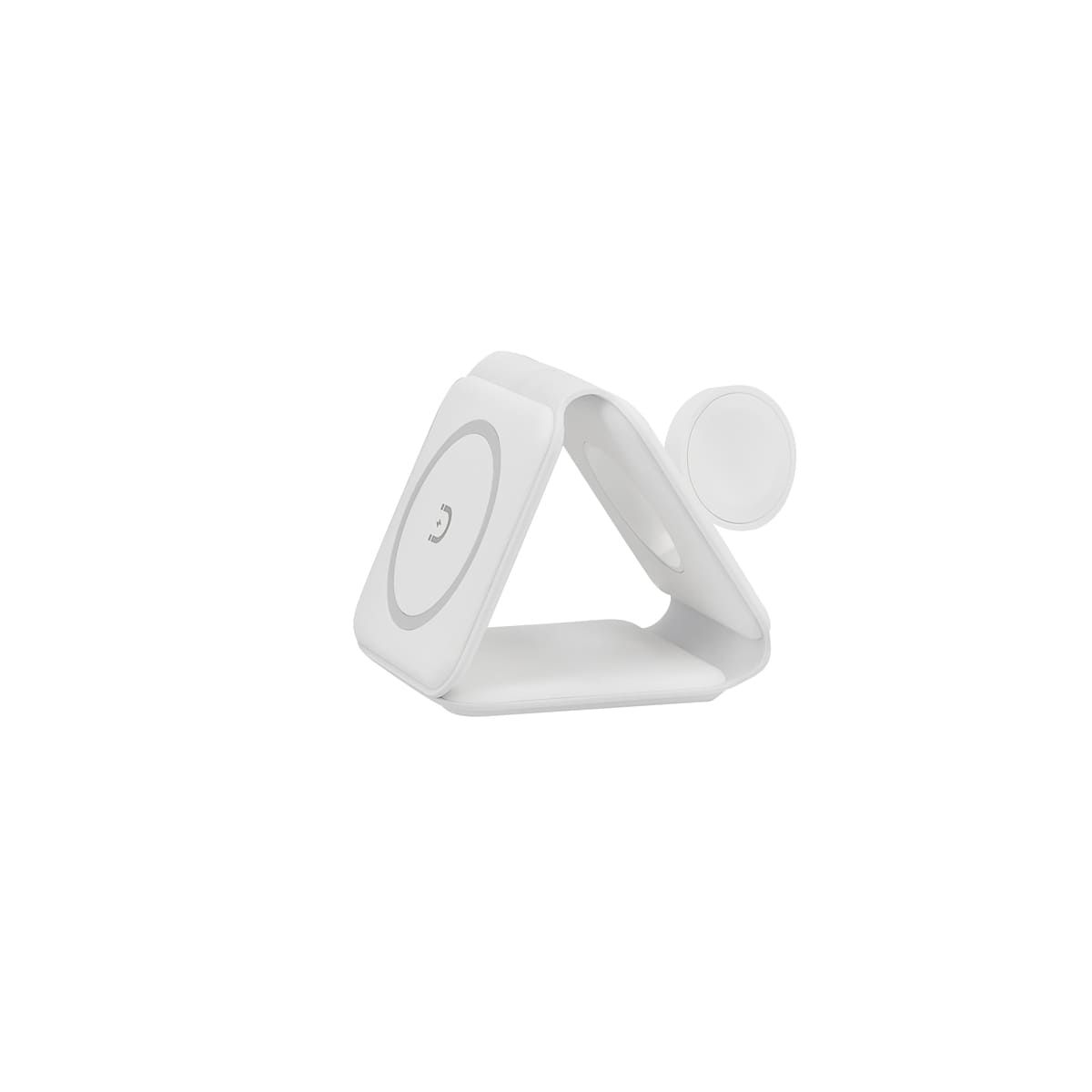 Cargador inalámbrico con diseño plegable. Terminado tipo rubber. Triple función. Incluye estación de carga para smartphone, reloj inteligente y audífonos. Velocidad de carga para smartphone de 15W (Compatible con 5W / 7.5W / 10W), velocidad de carga de 3W y 2.5W para audífonos y reloj inteligente respectivamente. Incluye cable auxiliar de 1m con conector tipo C en entrada y salida. LED indicador de carga. Compatible con dispositivos que cuenten con tecnología de carga inalámbrica.